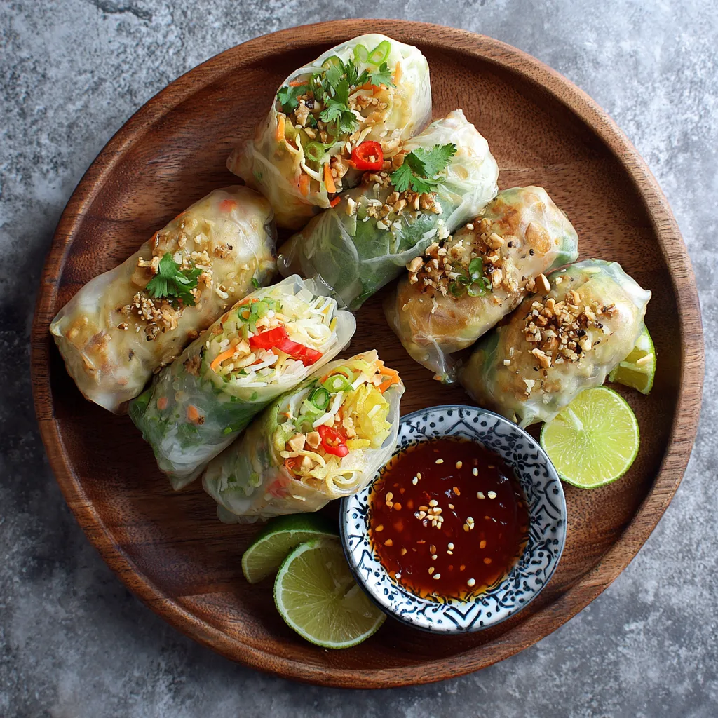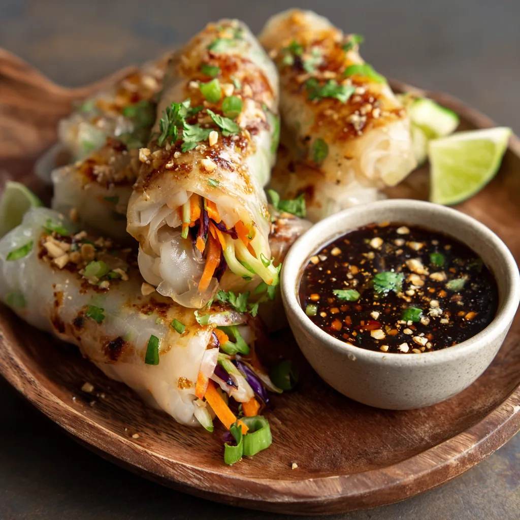 Crispy, chewy rice paper rolls filled with noodles and vegetables, air-fried to golden perfection.