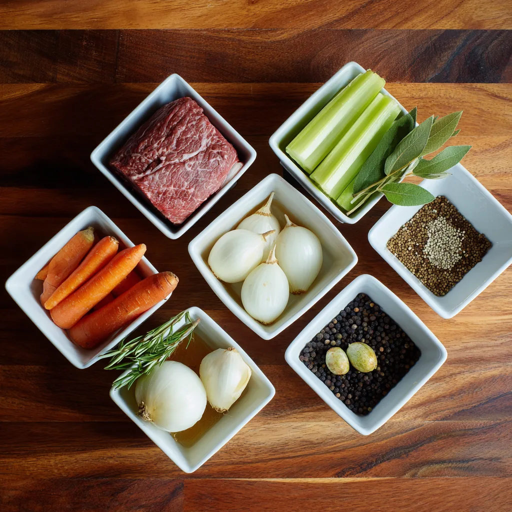 - Vegetables & Aromatics: Add sliced onions, carrots, and celery to the bottom of the slow cooker. Layer the seared beef on top.