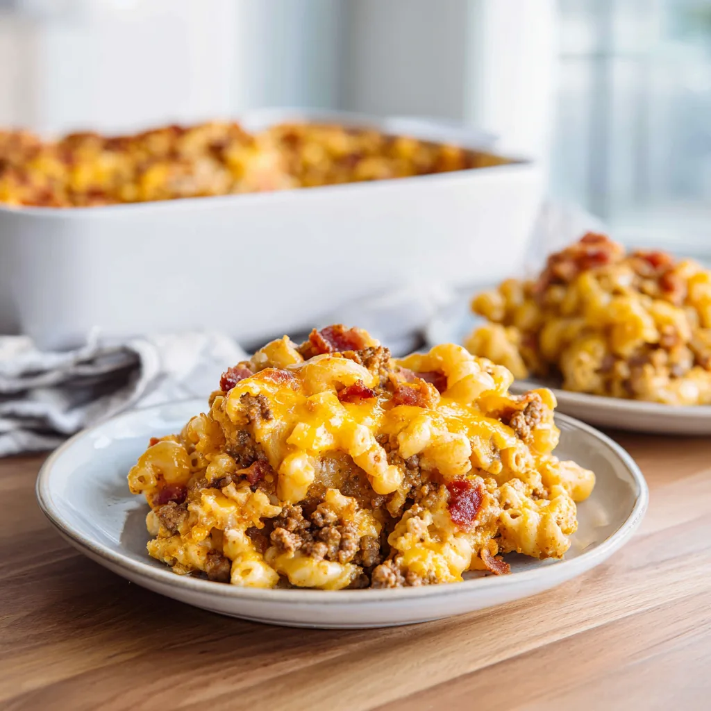Creamy baked mac and cheese loaded with ground beef, crispy bacon, and melted cheddar, bringing all the flavors of a bacon cheeseburger into one comforting casserole.