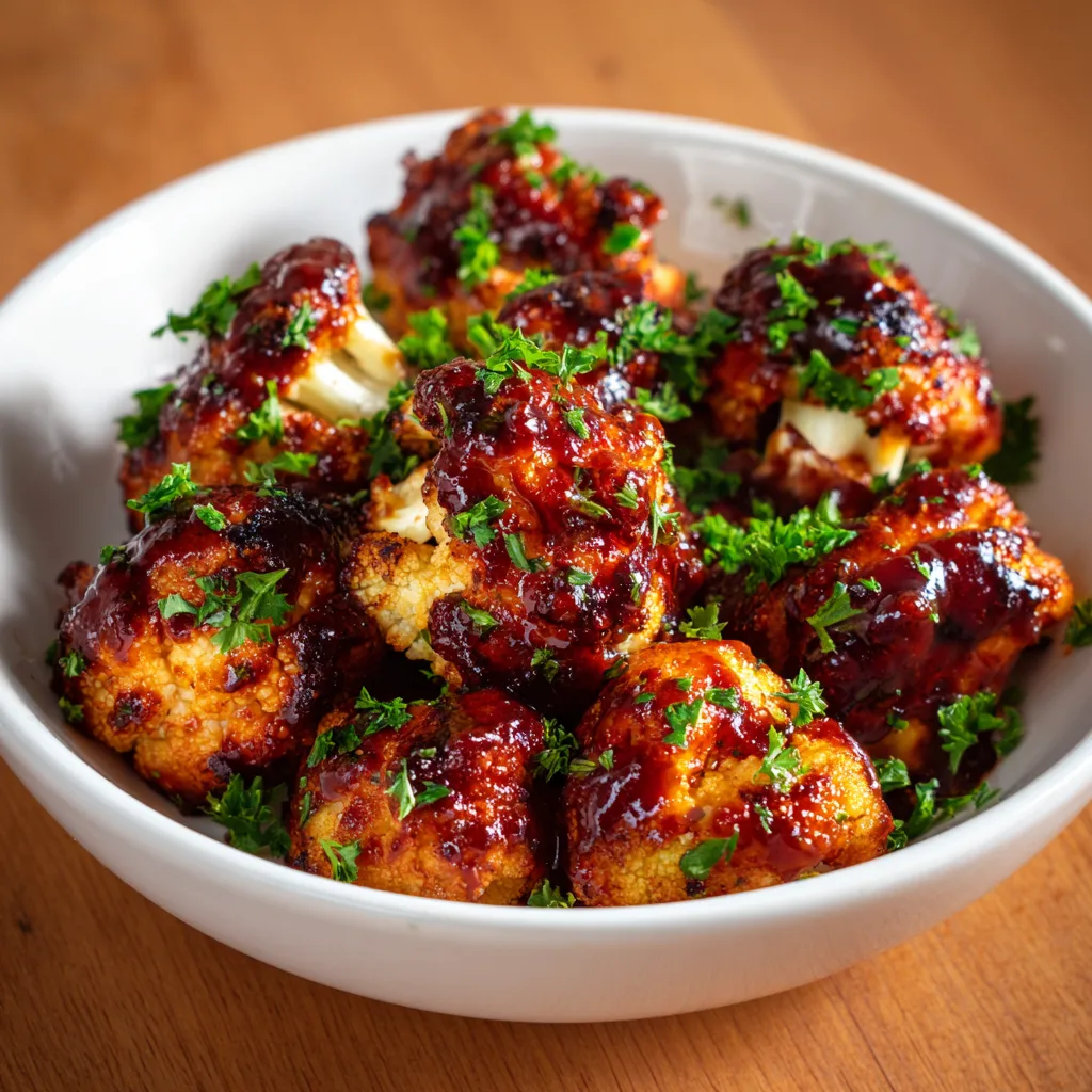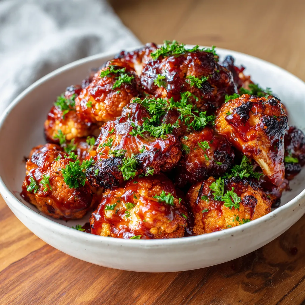 Crispy oven-baked cauliflower wings coated in smoky-sweet BBQ sauce for a delicious plant-based appetizer or snack.