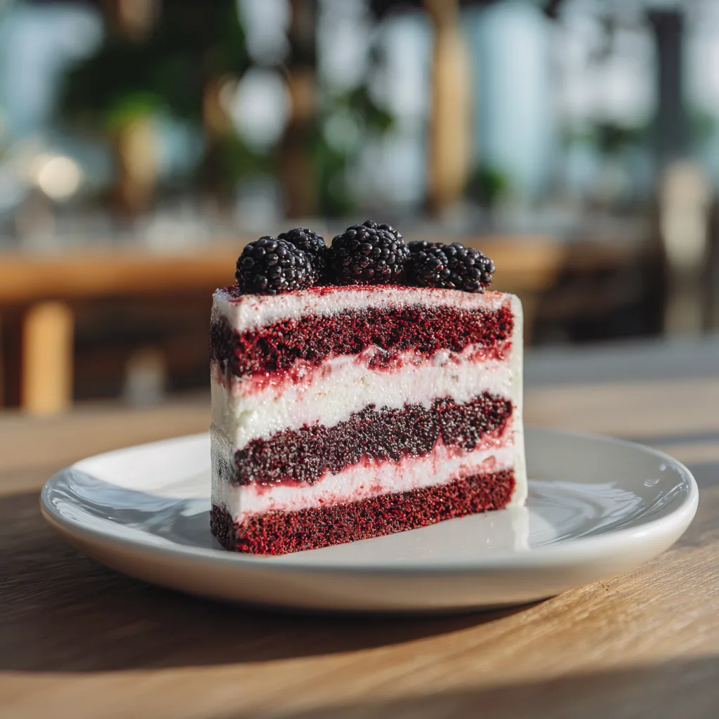 Fresh blackberries atop the cake appear like dark gemstones, plump and glossy.