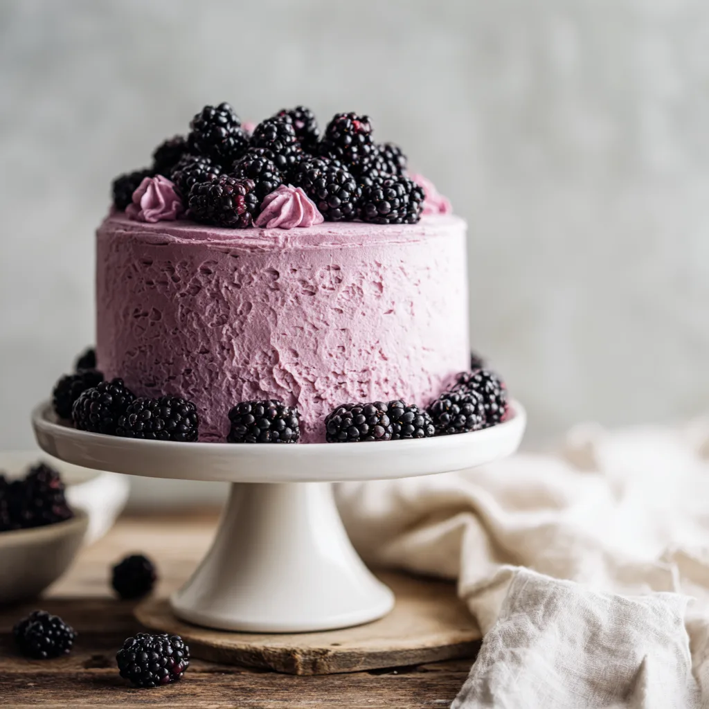 8. Assemble and frost cake, garnish with fresh blackberries.