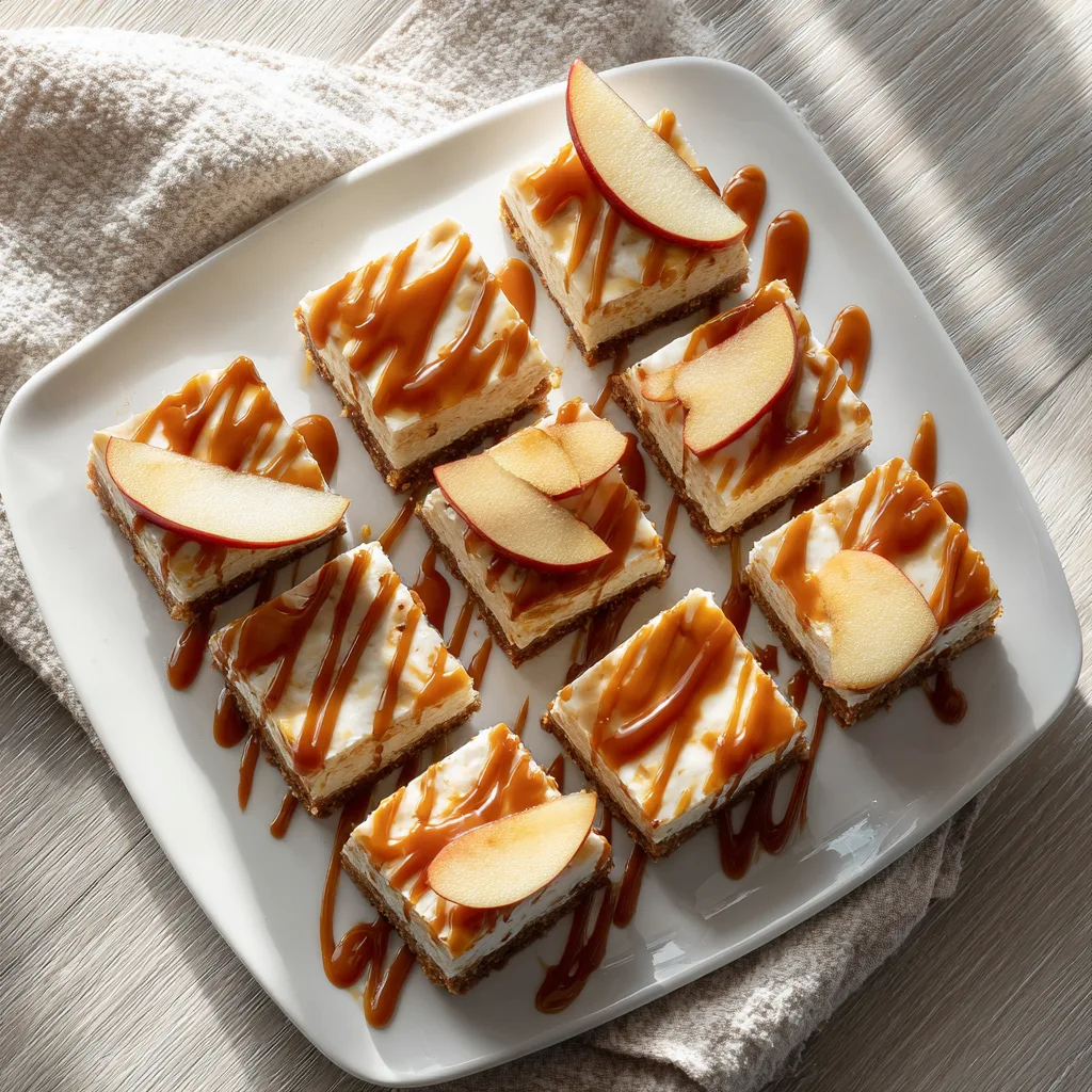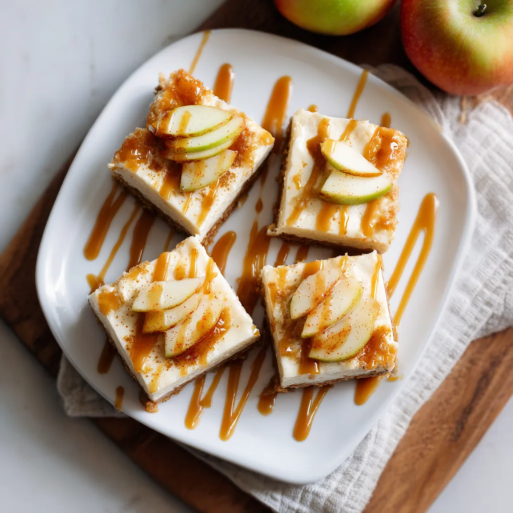 Delicious layered bars with a buttery crust, creamy cheesecake, tender spiced apples, and a rich caramel drizzle.