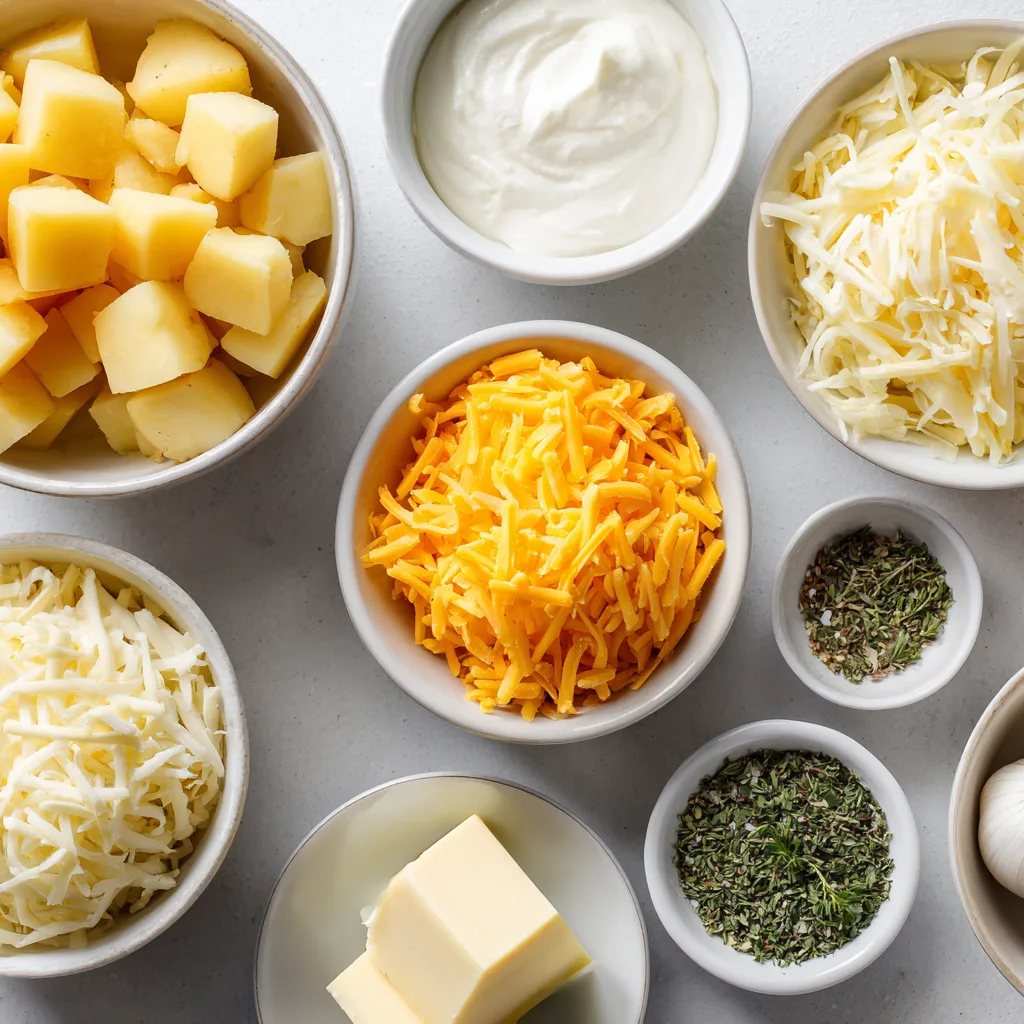 In a large bowl, combine melted butter, ranch seasoning, garlic powder, onion powder, sour cream, and heavy cream. - Combine potatoes and cheese mixture.