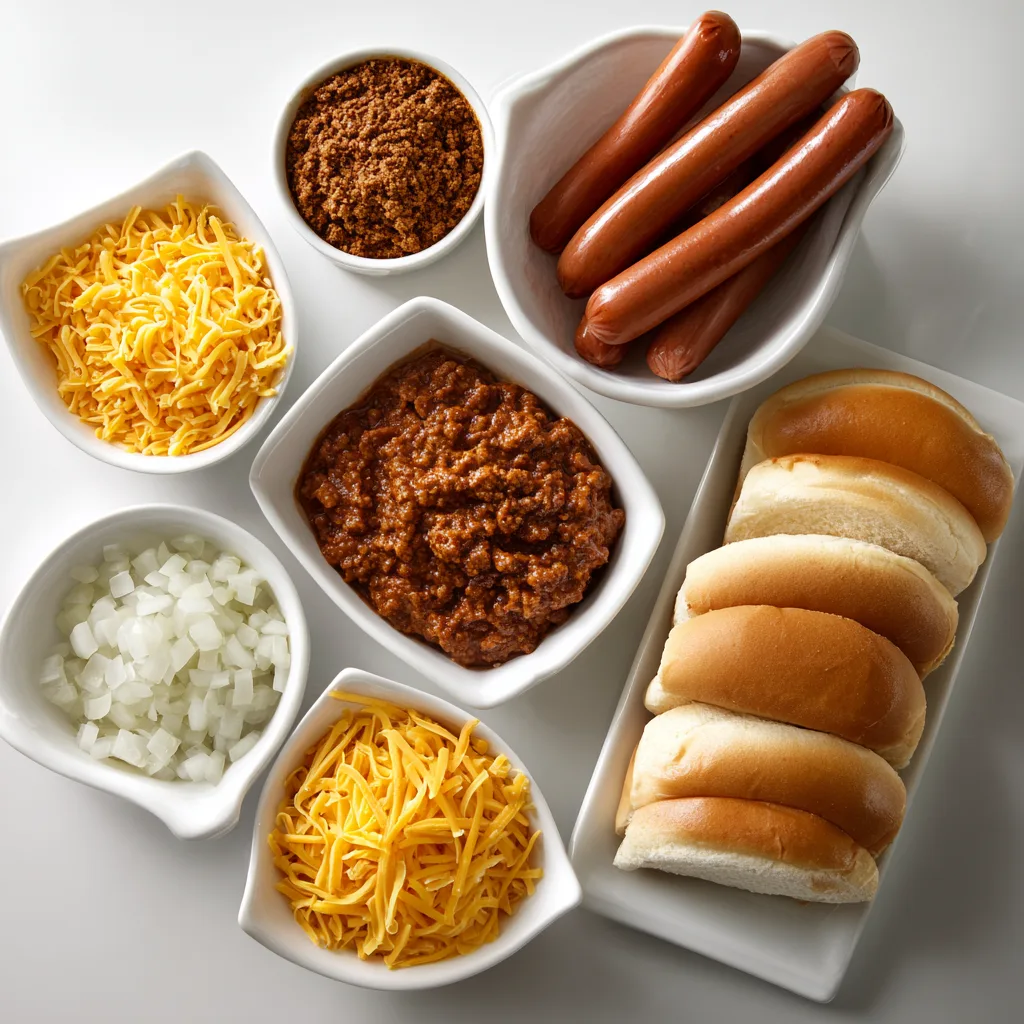 In a skillet, sauté onion and garlic until translucent. Add ground beef and cook until browned. Stir in tomato sauce, chili powder, cumin, paprika, salt, and pepper. Simmer 10–15 minutes until thickened. - Cook hot dogs: