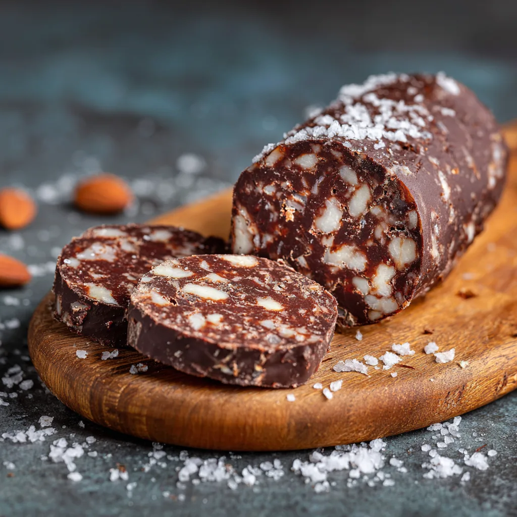 A classic no-bake European dessert made with rich chocolate and crunchy biscuits, shaped like a salami and sliced to serve.