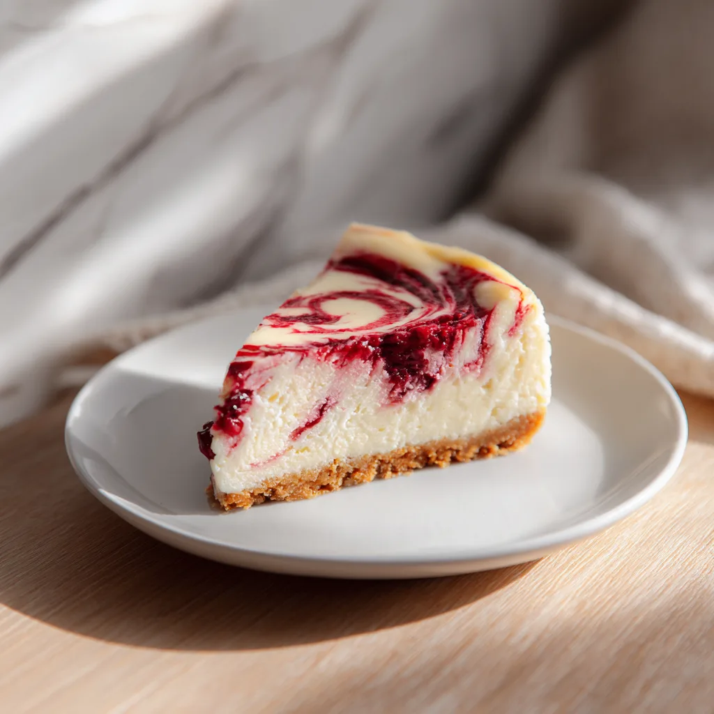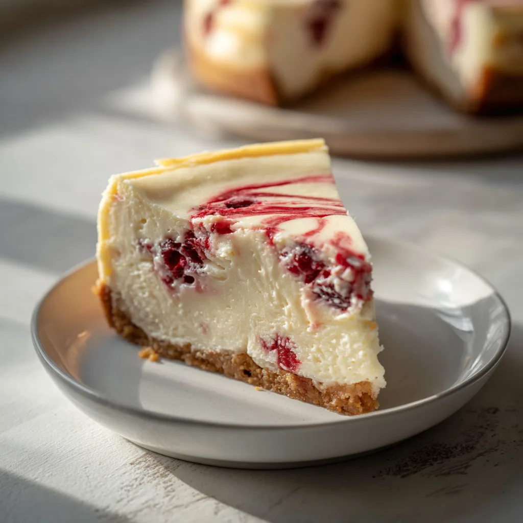 The crimson cranberry ribbons running through the cheesecake resemble holiday decor—festive, bright, and elegant.