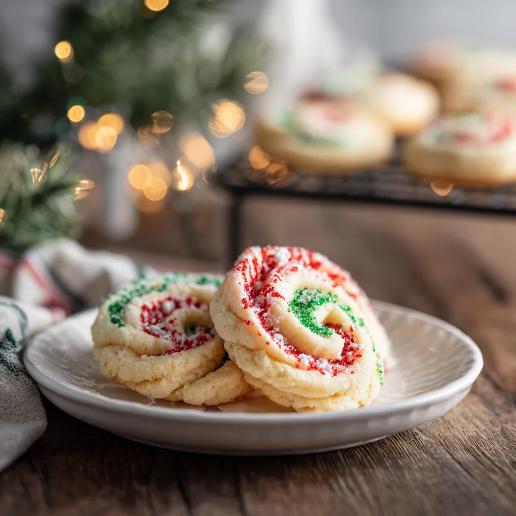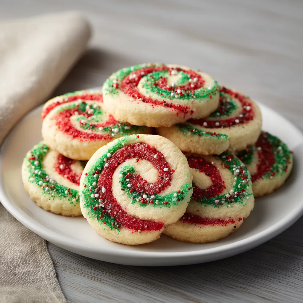 These cookies begin with a classic buttery sugar cookie dough — soft, smooth, easy to roll, and flavored simply with vanilla so the colors shine. Once prepared, the dough is divided and tinted: traditionally one red layer and one green, though you can use any holiday color combination. The two dough sheets are layered, rolled tightly into a log, chilled, and sliced into beautiful spirals.