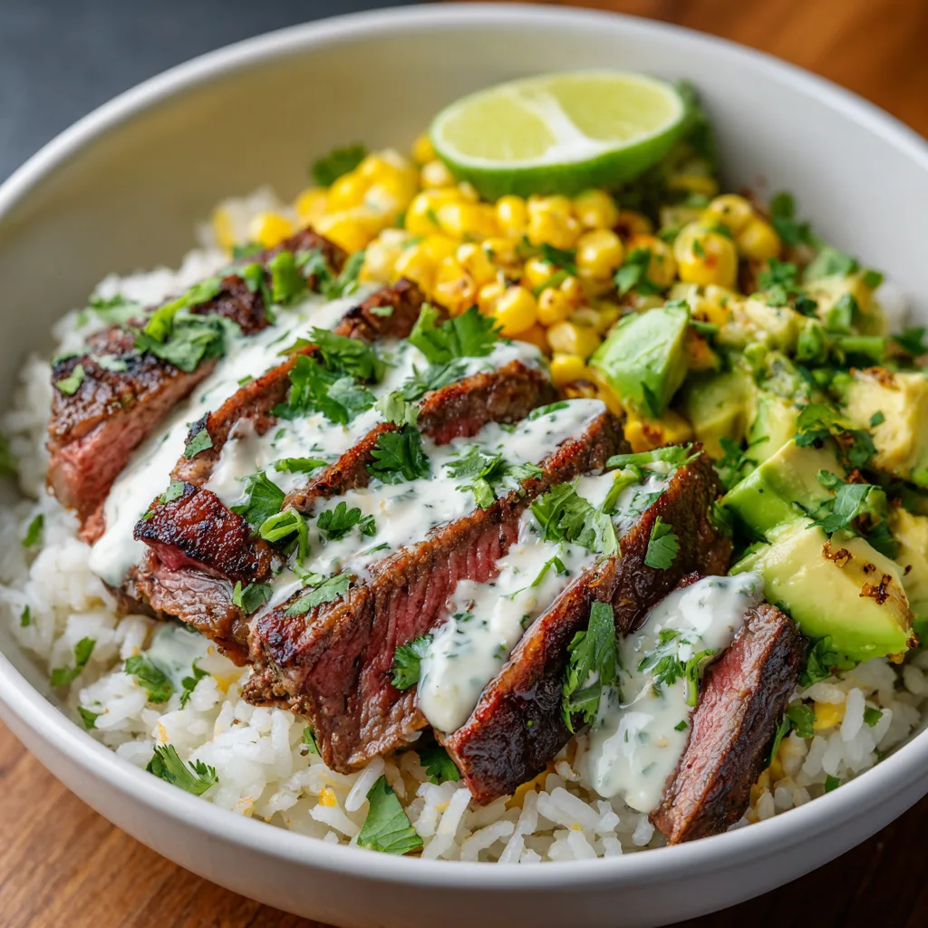 Imagine sitting in your favorite upscale bistro — the air filled with the aroma of sizzling steak, charred corn, and fresh herbs. The waiter sets down a bowl that looks like art — tender steak slices draped over fluffy cilantro-lime rice, dotted with creamy avocado, crunchy peppers, and a tangy drizzle that ties it all together.