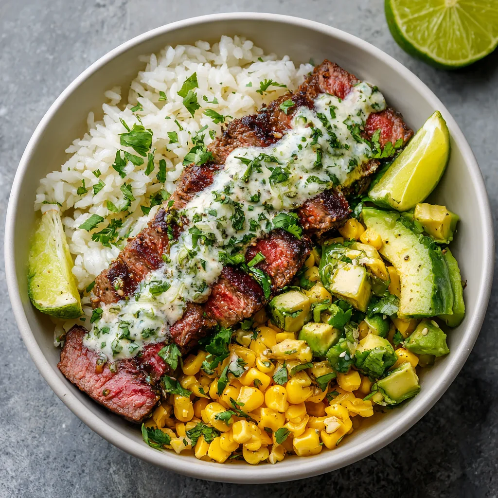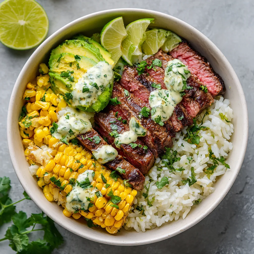 Spoon cilantro-lime rice into bowls. Top with sliced steak, corn, avocado, onion, and tomatoes. Drizzle creamy lime dressing generously. Sprinkle cheese and garnish with lime wedges. - Serve & Enjoy: