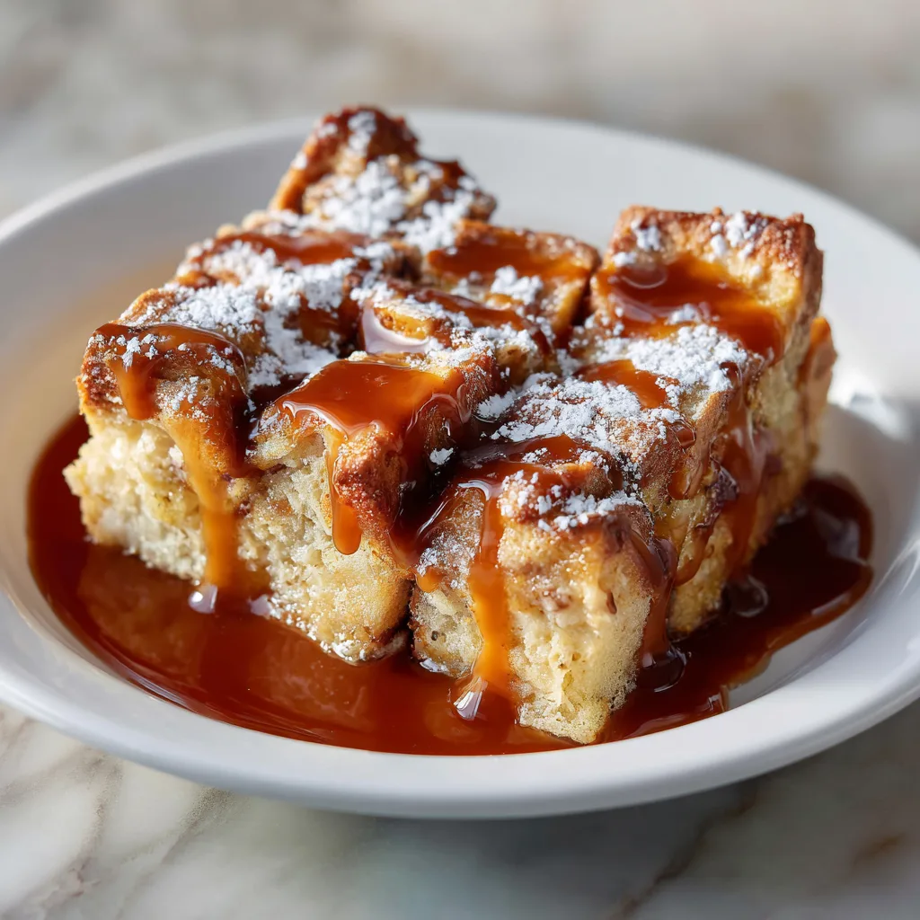 - Serve warm bread pudding topped with caramel sauce.