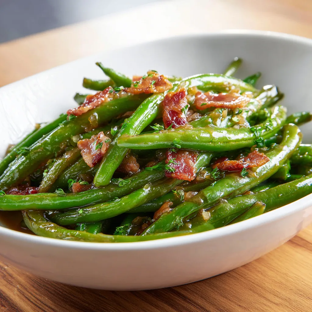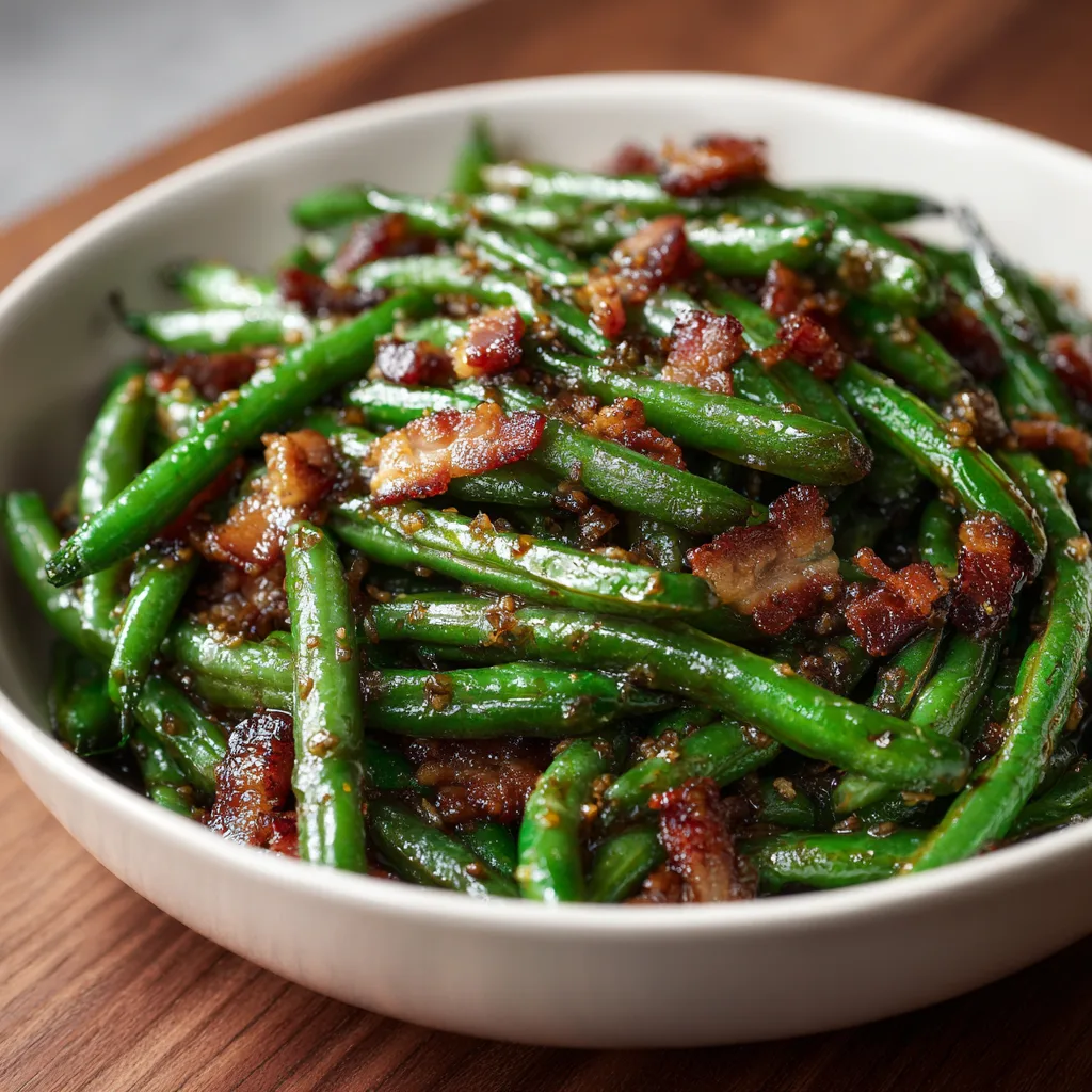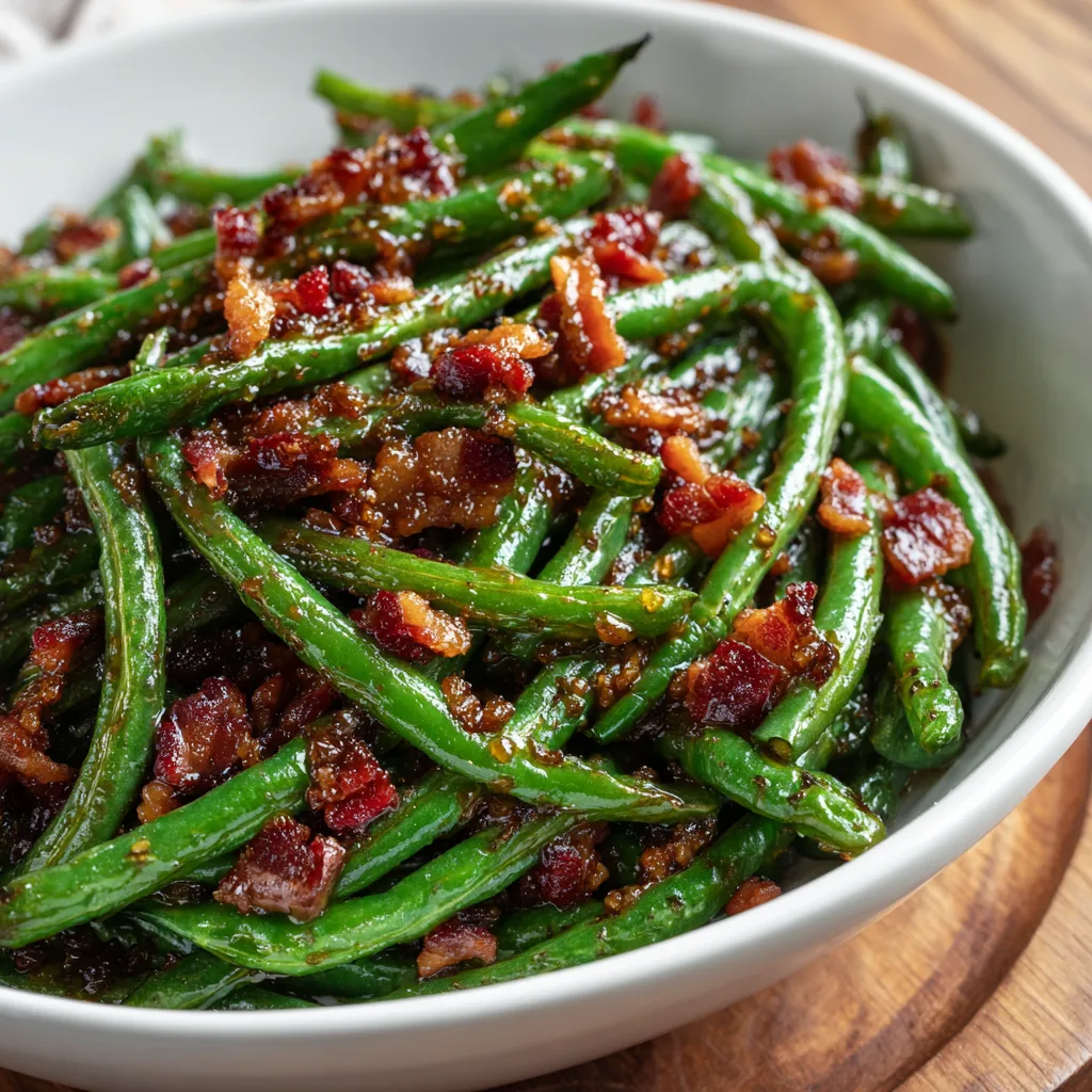 Sweet, sticky, and savory green beans tossed with crispy bacon and a rich brown sugar–soy glaze. Perfect for holidays, weeknights, and potlucks.