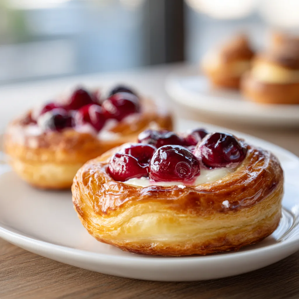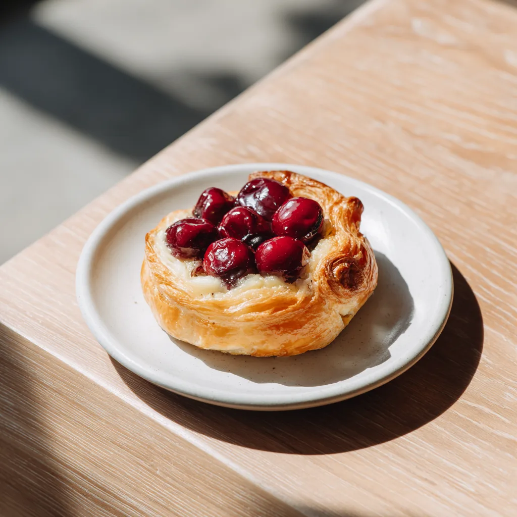 Flaky puff pastry filled with sweet vanilla cream cheese and topped with juicy cherries for a classic bakery-style treat.