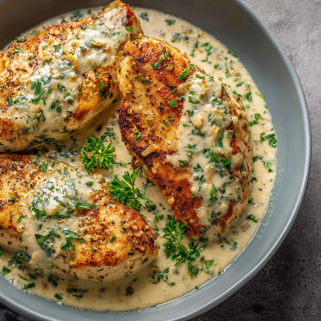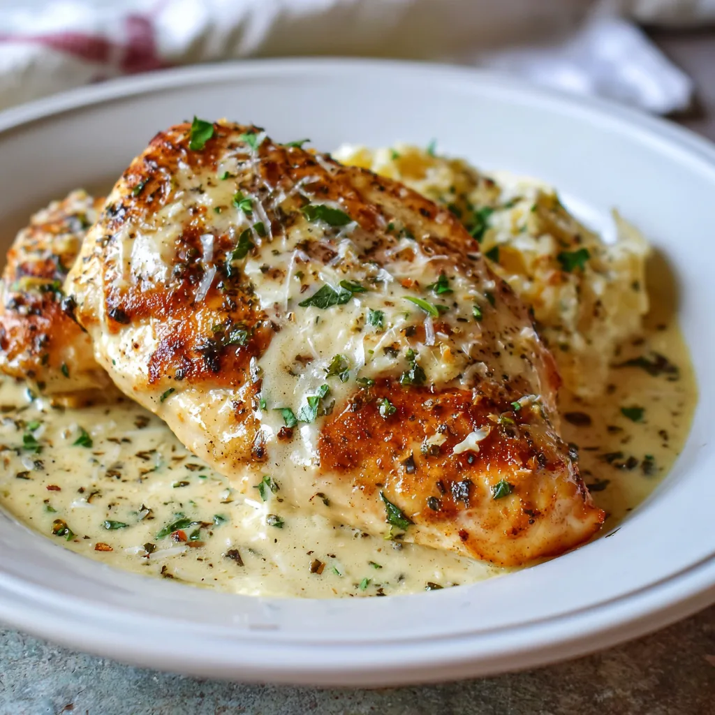 Juicy chicken breasts cooked in a rich garlic Parmesan cream sauce for a comforting and easy dinner.
