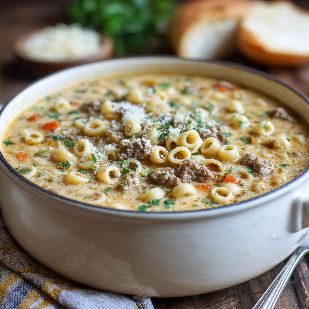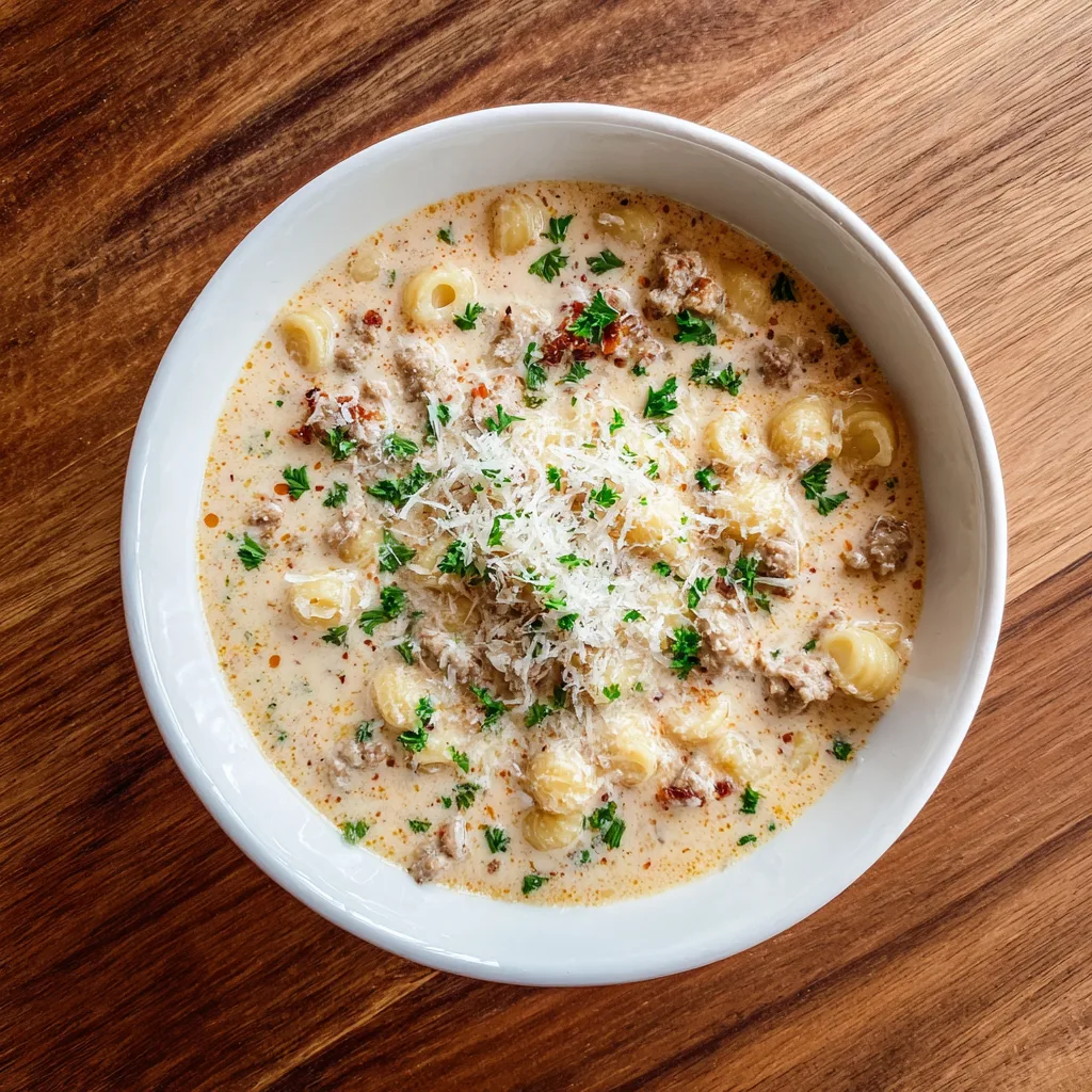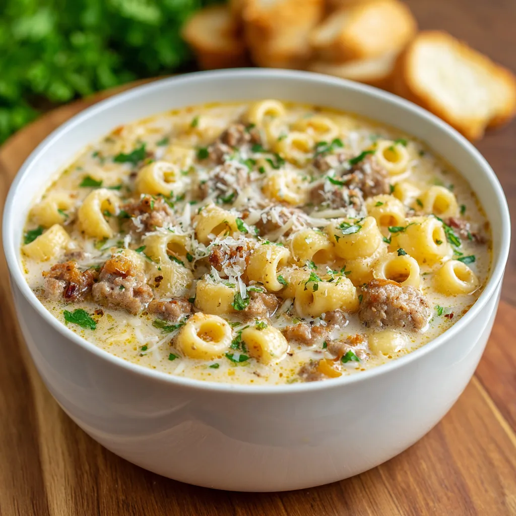 A hearty, creamy soup featuring Italian sausage, ditalini pasta, vegetables, and a rich Parmesan broth—perfect for comfort meals.