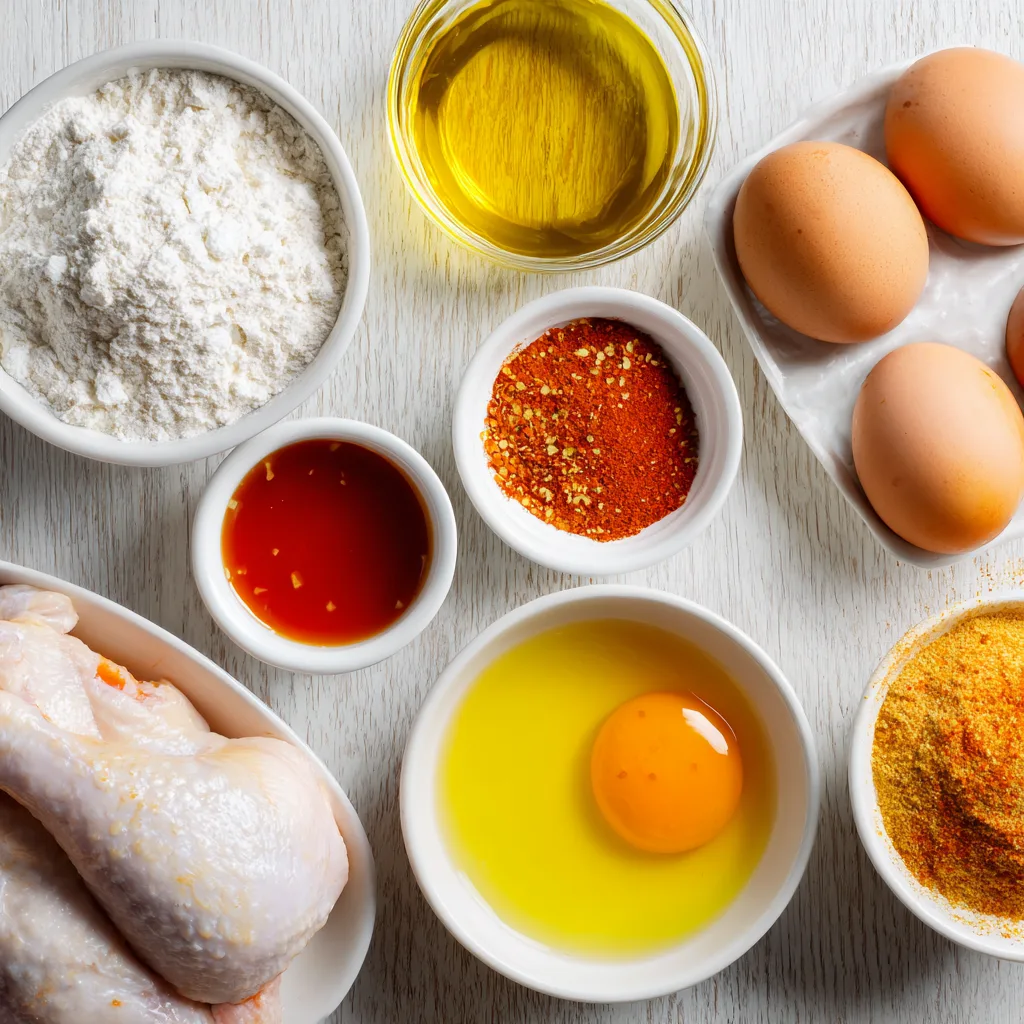• Eggs & Olive Oil: Eggs help the flour adhere to the chicken, while olive oil enhances crispiness without frying.
