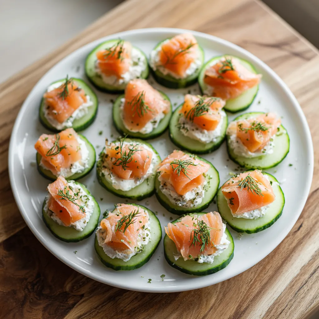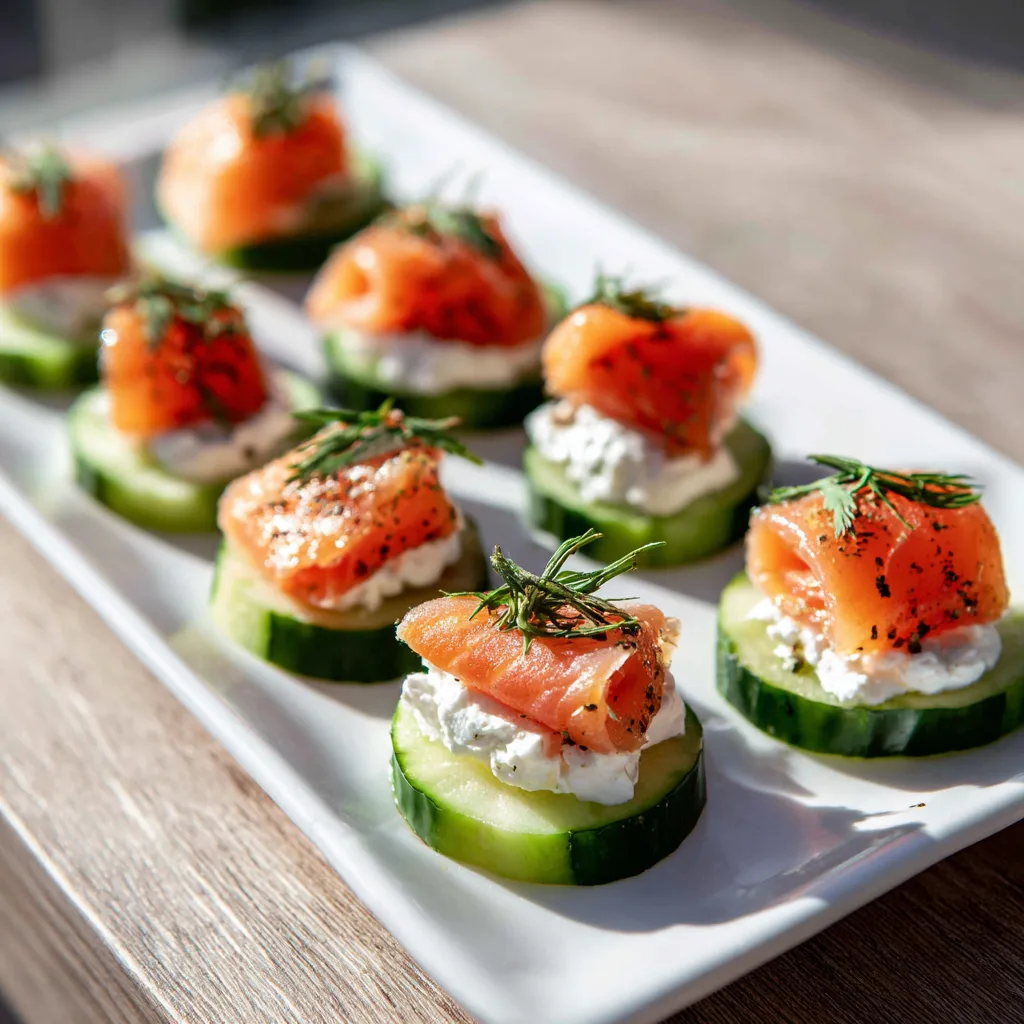 Fresh cucumber slices topped with creamy cheese, smoked salmon, and herbs for a light and elegant appetizer.