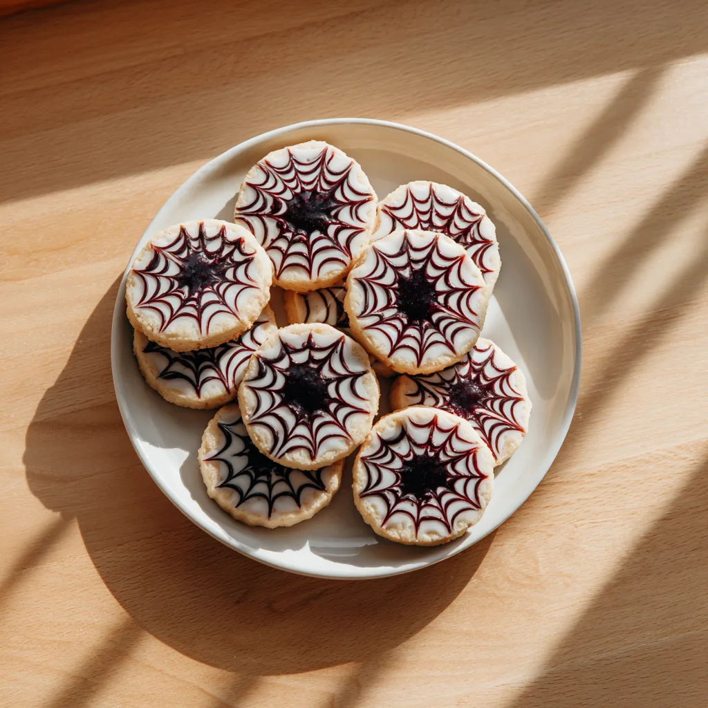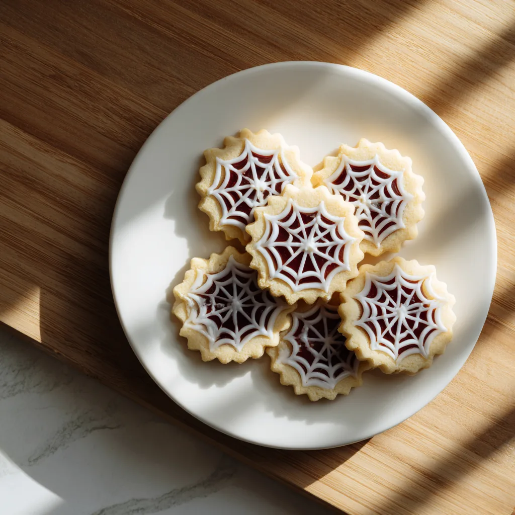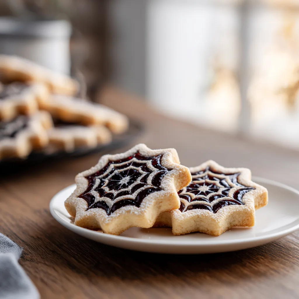Linzer cookies are traditionally sandwich cookies filled with raspberry, apricot, or strawberry jam. The Halloween version adds spiderweb piped icing for a fun and seasonal twist, making them ideal for children, parties, or themed dessert tables.