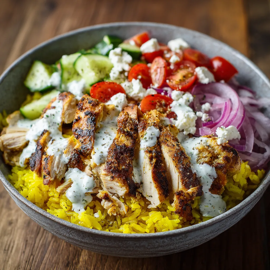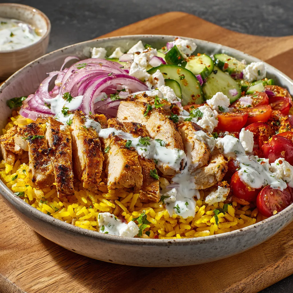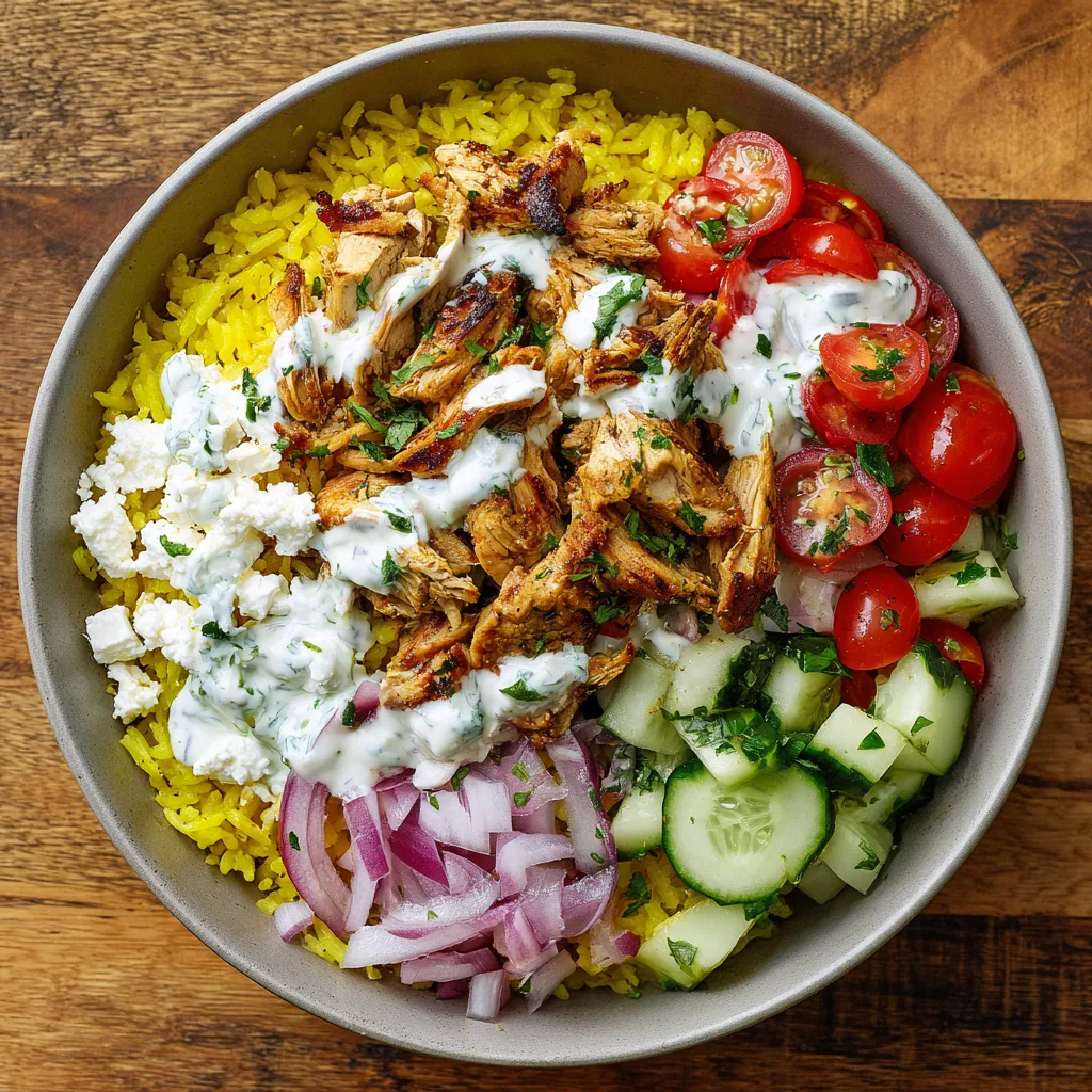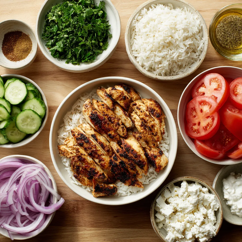 - Assemble bowls: base of rice, sliced chicken, diced cucumbers, cherry tomatoes, red onion, parsley, optional feta or pickled vegetables, drizzle with garlic yogurt sauce, serve with lemon wedges.