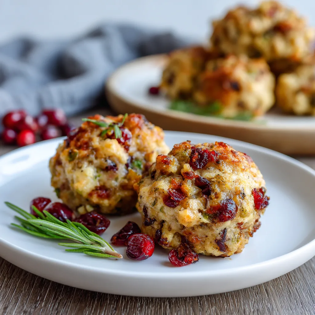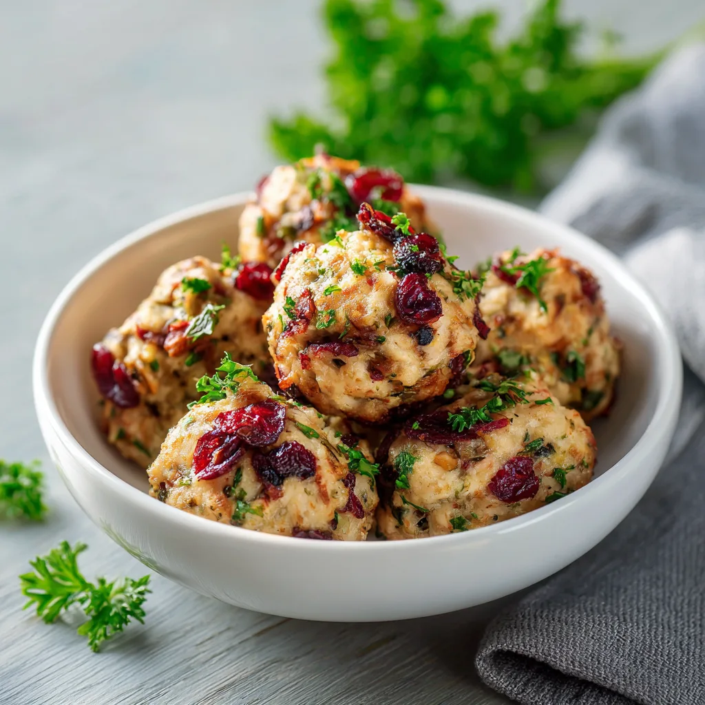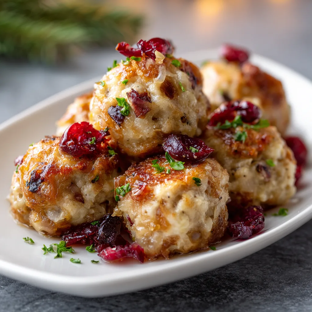 Savory holiday stuffing mixed with tender turkey, herbs, and a touch of cranberry, shaped into warm bite-sized appetizer balls perfect for gatherings.