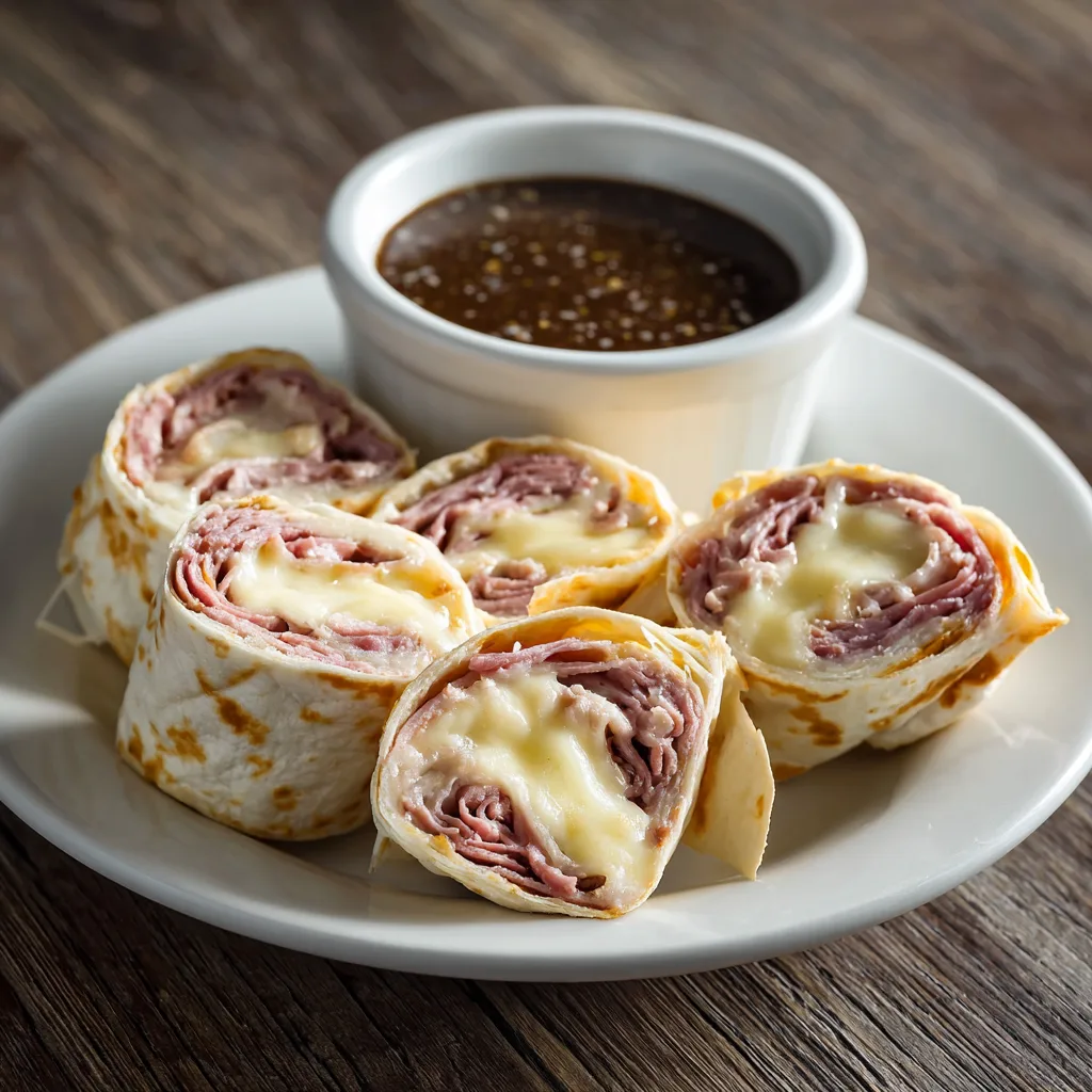 Savory and cheesy French Dip-style roll ups, perfect for parties or lunch, served with dipping au jus.