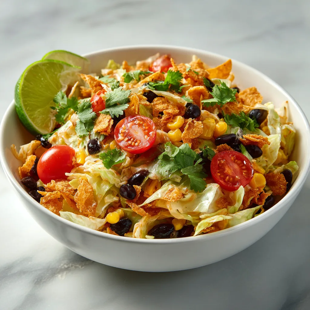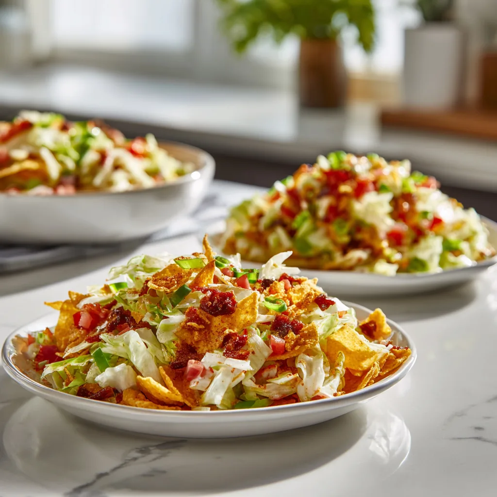 This easy-to-make salad balances freshness with crunch, making it a family favorite that’s both healthy and flavorful. The Fritos topping adds a playful twist, reminiscent of classic “cowboy” salads from the American Southwest, while the colorful ingredients create a visually stunning dish that’s perfect for entertaining or meal prep.