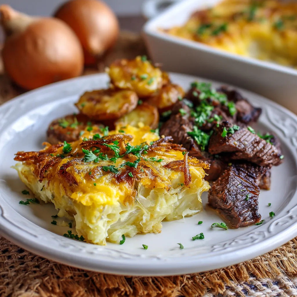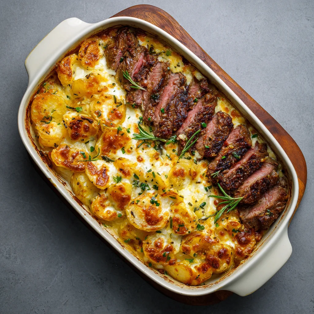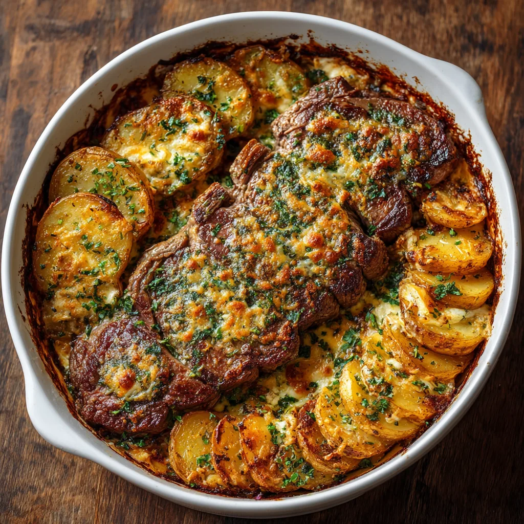 A rich and comforting one-pan bake featuring tender steak, creamy potatoes, sharp cheddar, and garlic butter.