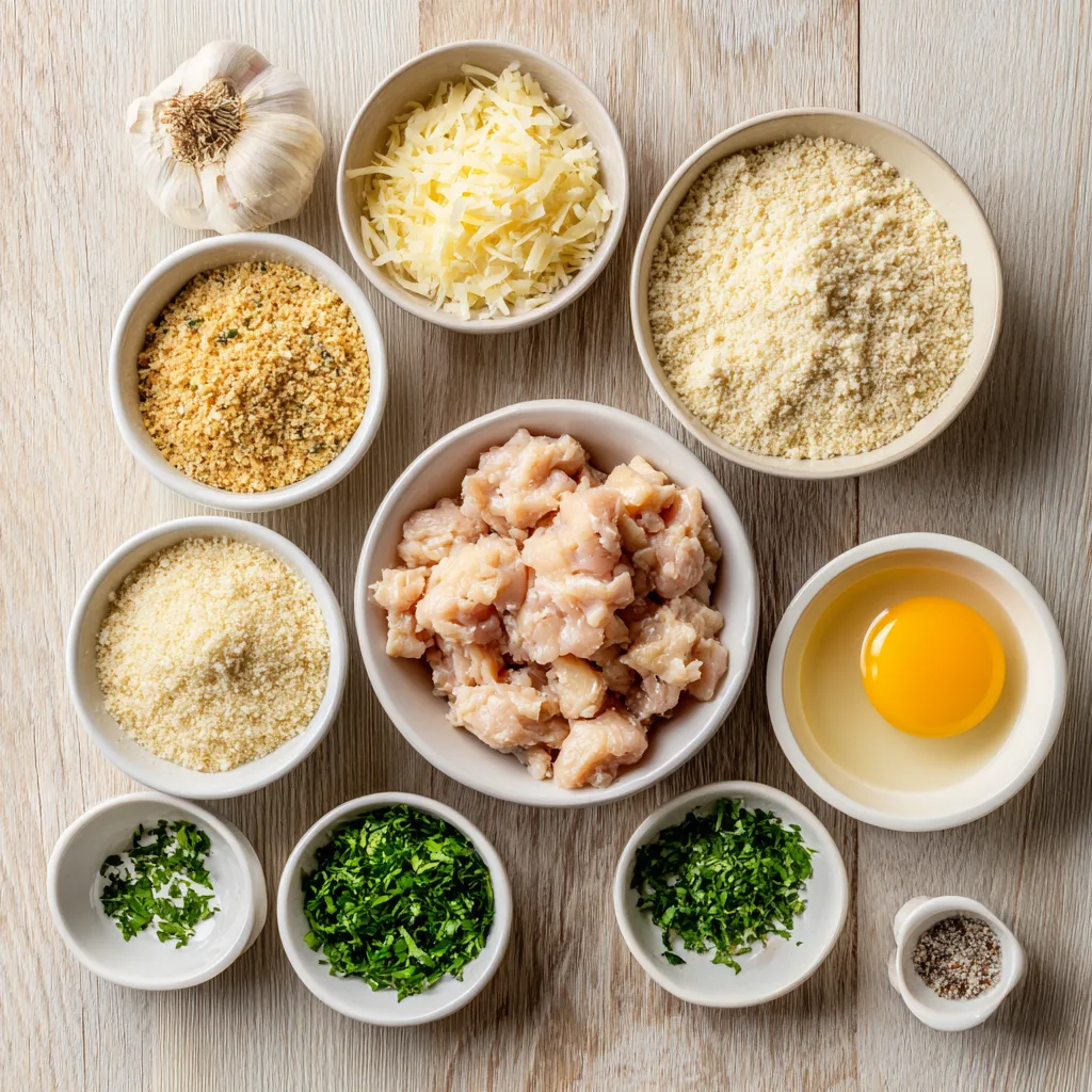 2. In a large mixing bowl, combine ground chicken, Parmesan, minced garlic, breadcrumbs, egg, parsley, salt, pepper, and red pepper flakes if using.