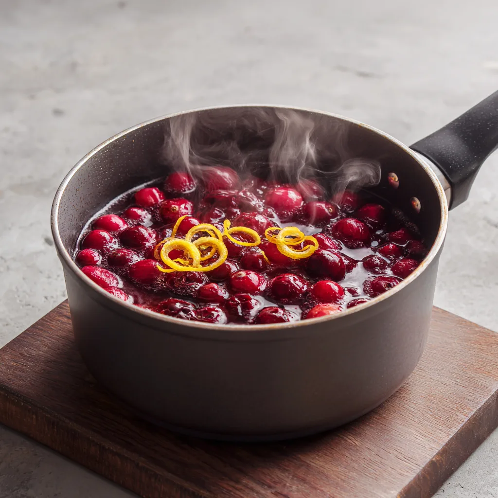 4. Stir in cinnamon stick and orange zest. Simmer for 10–12 minutes until cranberries pop and the sauce thickens.