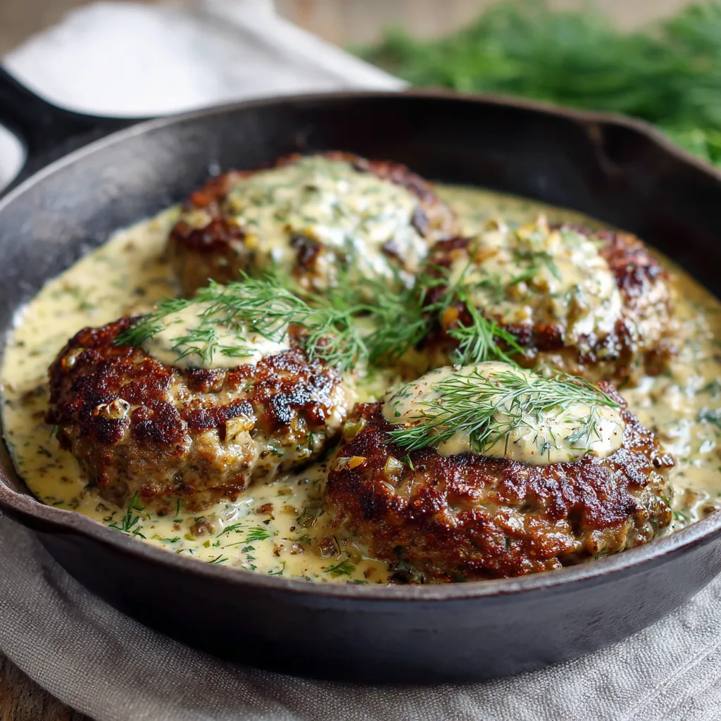 Juicy hamburger patties cooked in a rich and creamy dill sauce, perfect for comforting weeknight dinners or family meals.