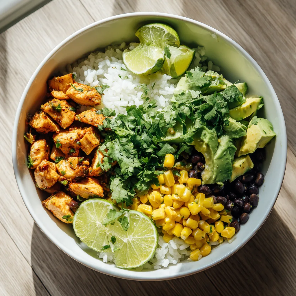 - Assemble bowls with rice, chicken, corn, black beans, and avocado.