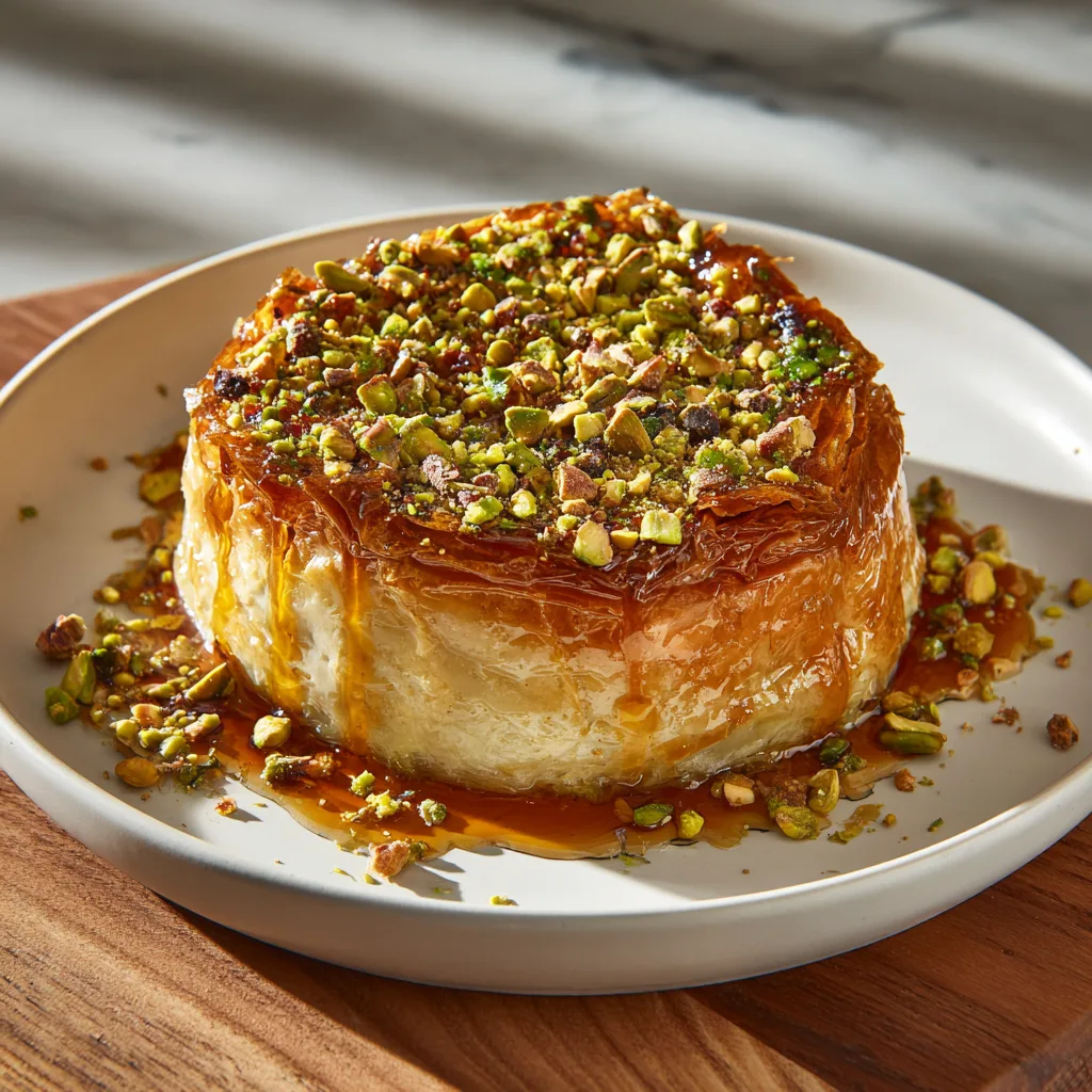 This layered dessert is sweet, crunchy, and indulgent — featuring a buttery phyllo crust, creamy honey-infused cheesecake filling, and a topping of golden pistachios and drizzled honey. It’s perfect for special occasions, festive holidays, or any time you want a dessert that wows both in flavor and presentation.