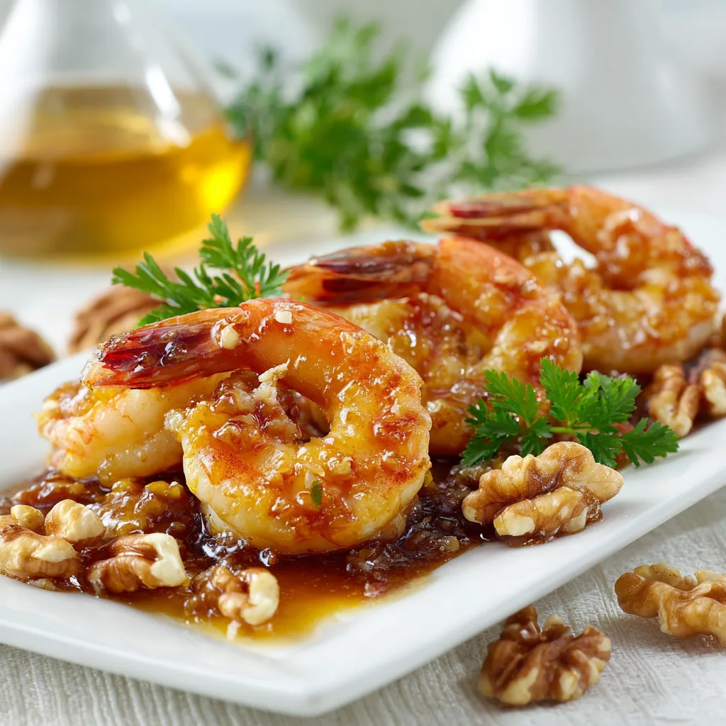 Crispy fried shrimp tossed in a creamy honey sauce and topped with sweet candied walnuts, perfect for dinner or special occasions.