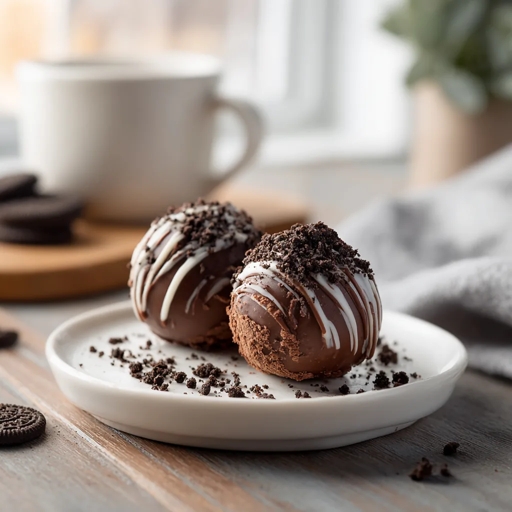 Rich, creamy Oreo truffles infused with hot chocolate flavor and coated in glossy dark chocolate for the perfect winter treat.