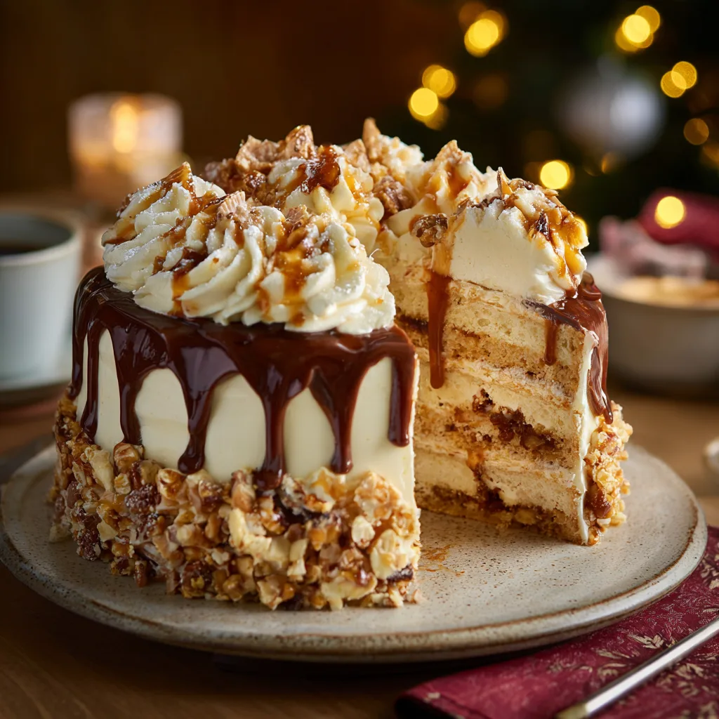 A festive layered cake with buttery sponge, creamy frosting, and irresistible homemade toffee crunch, perfect for the holidays.