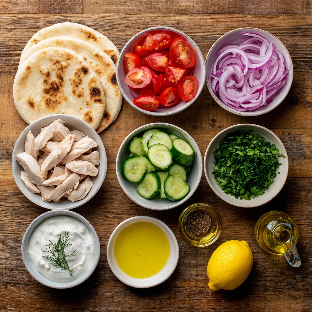 - Assemble gyros with chicken, tomato, cucumber, onion, feta, and tzatziki. Garnish with parsley or dill.