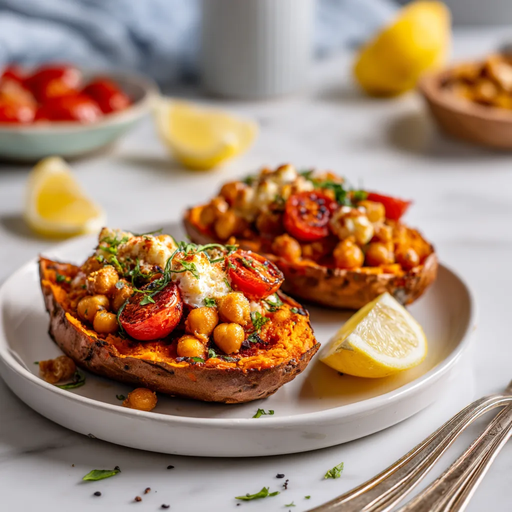 Roasted sweet potatoes filled with chickpeas, cherry tomatoes, olives, and feta, seasoned with Mediterranean spices.