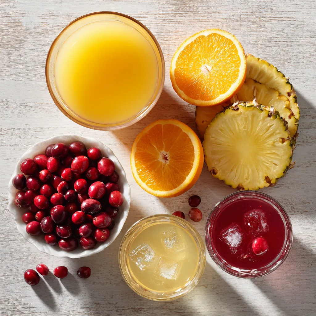 - Prepare the base: In a large pitcher or punch bowl, combine cranberry juice, orange juice, and pineapple juice. Stir gently.