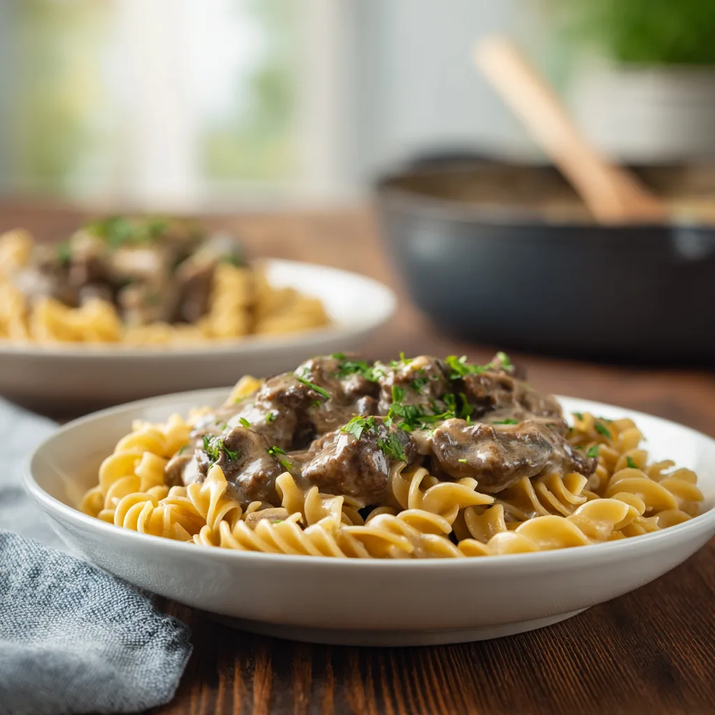 Few recipes capture the heart of comfort food like a steaming bowl of Beef Stroganoff. Originating from Russia but beloved worldwide, this dish has traveled through generations and kitchens, reinventing itself along the way. Traditionally, Stroganoff is made with tender strips of beef, onions, mushrooms, and a luscious sour cream sauce. Today, we’re taking it up a notch with a modern one-pot twist—keeping the flavor authentic while making the process quicker, easier, and perfect for busy weeknights.
