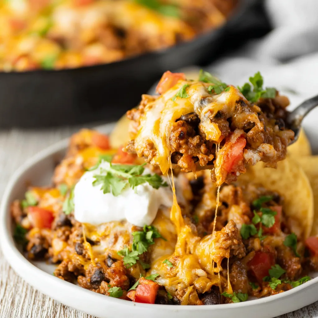 This dish is everything you love about tacos but with fewer steps and less mess. Instead of prepping multiple toppings and sides, everything cooks together in one skillet. The result? Bold flavors, melty cheese, and a dish that’s versatile enough to eat in different ways: