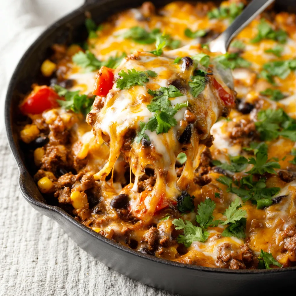 Taco Tuesday just got even easier (and tastier)! This One-Pot Taco Skillet combines everything you love about tacos—seasoned beef, beans, veggies, cheese, and spices—into one hearty, cheesy skillet meal. Think of it as a cross between a taco, a casserole, and a Mexican-inspired stir-fry.