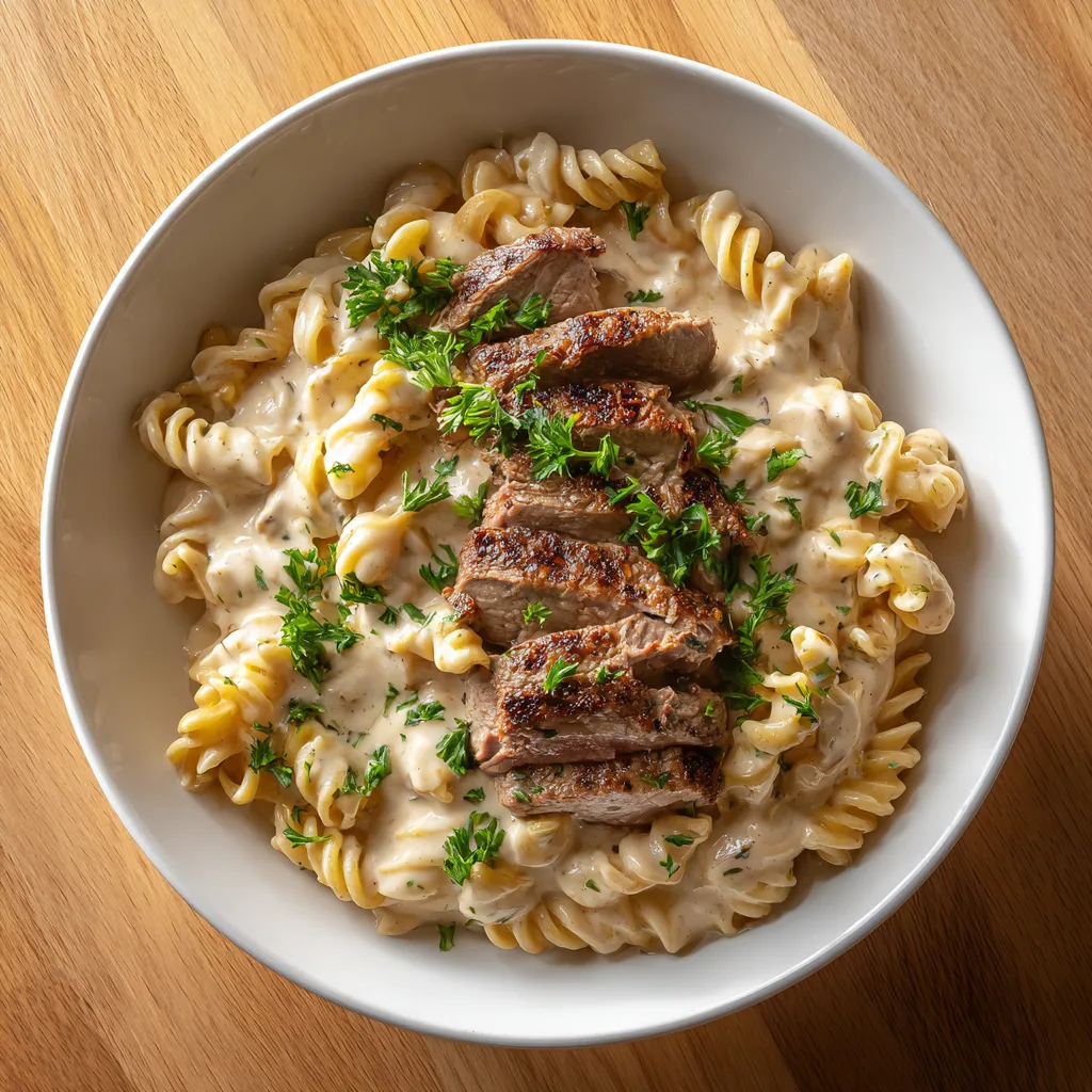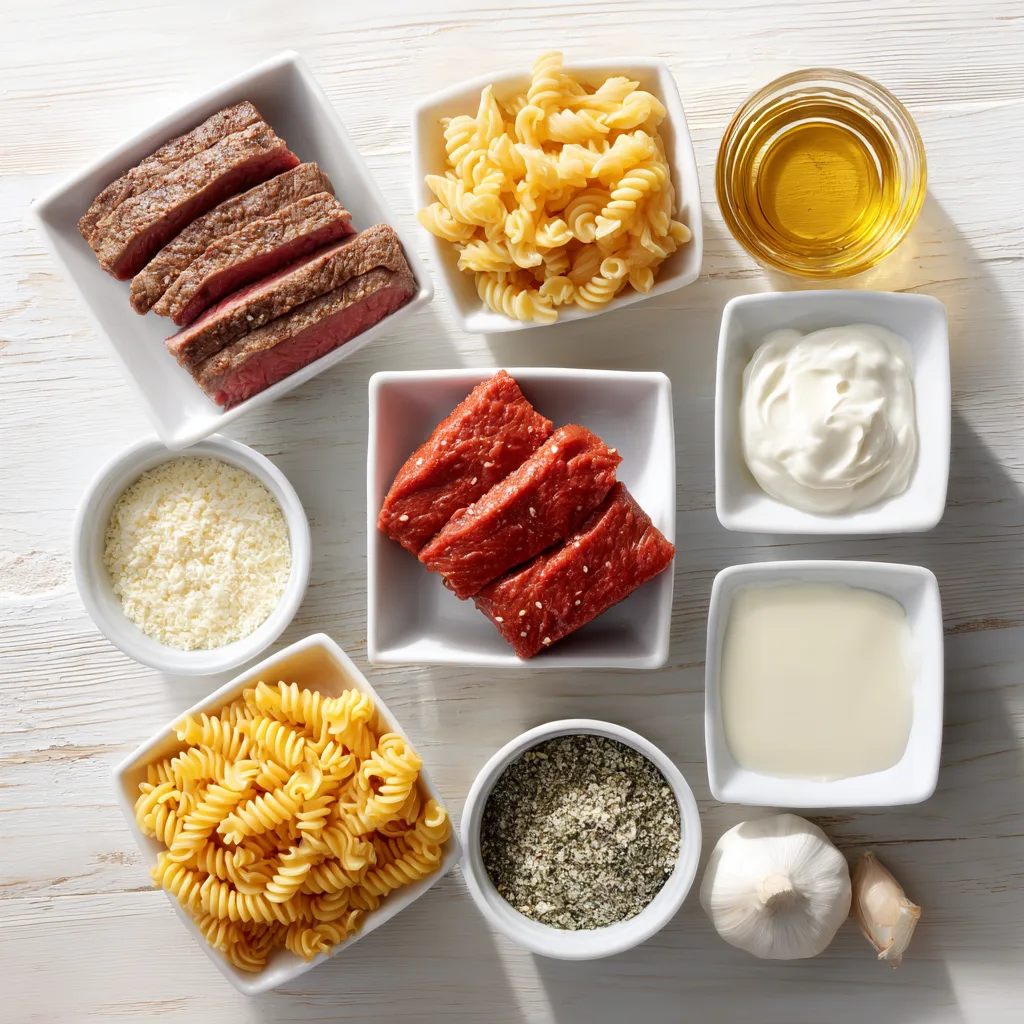 It blends creamy pasta, juicy steak, and the tangy heat of buffalo sauce with the cool herby balance of ranch seasoning.