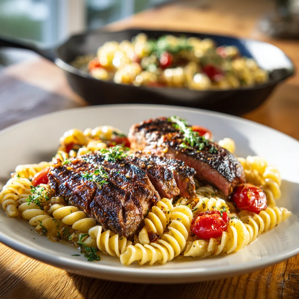 Creamy, spicy buffalo ranch pasta with tender steak slices cooked in one skillet for a bold and comforting dinner.