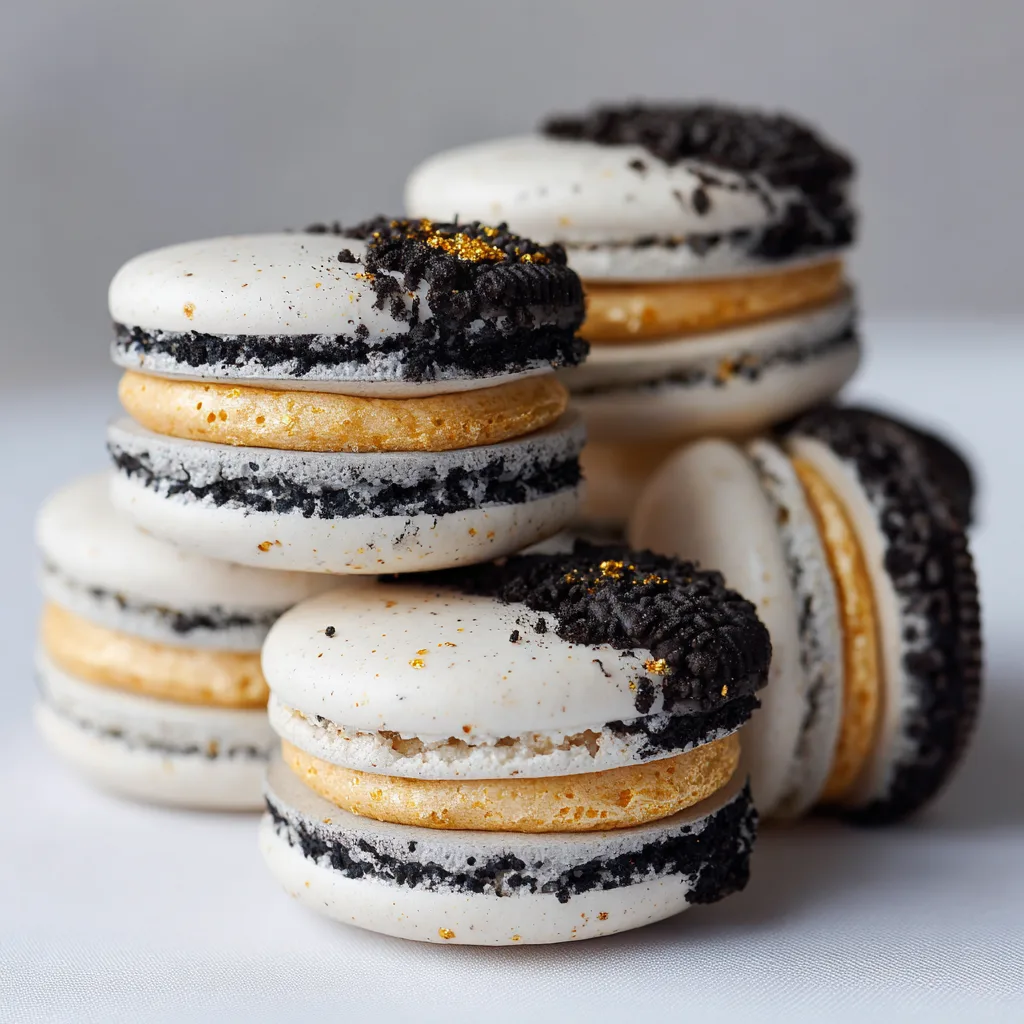 Delicate French macarons filled with creamy Oreo buttercream, combining chocolate and vanilla flavors in each bite.