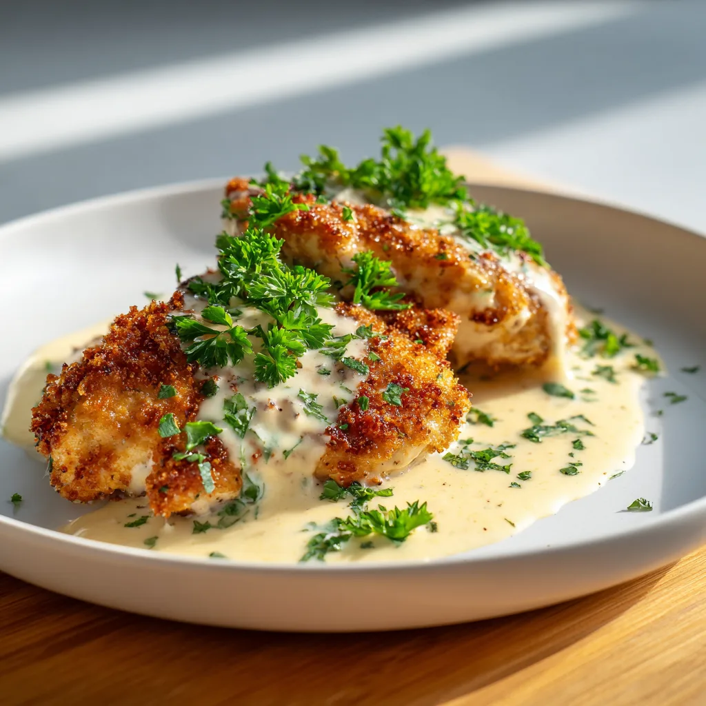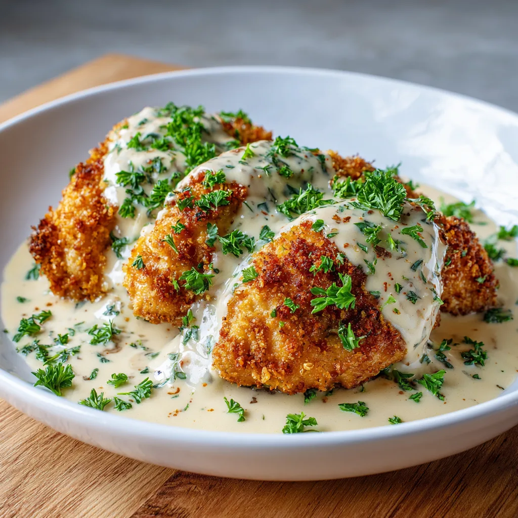 Crispy, golden chicken breasts coated in parmesan, lightly seasoned, and baked to perfection. Each piece is smothered in a creamy garlic sauce that is indulgent yet approachable. This dish is savory, comforting, and elegant enough for guests yet easy enough for a family dinner.