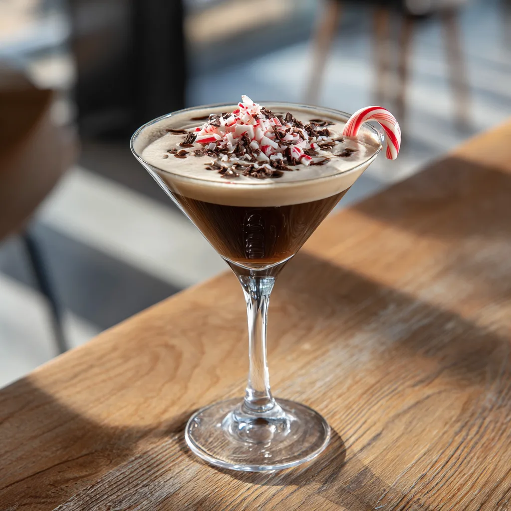 Festive espresso martini with peppermint liqueur, perfect for holiday parties and winter gatherings.