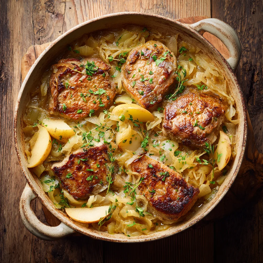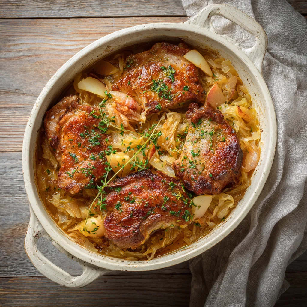 The sauerkraut mellows as it bakes, becoming tender and softly tangy instead of sharp. The pork becomes fork-tender and juicy, absorbing both savory broth and gentle acidity. The onions sweeten. The apples soften. Everything melds. Every bite tastes like something meant — like a dish made with purpose.