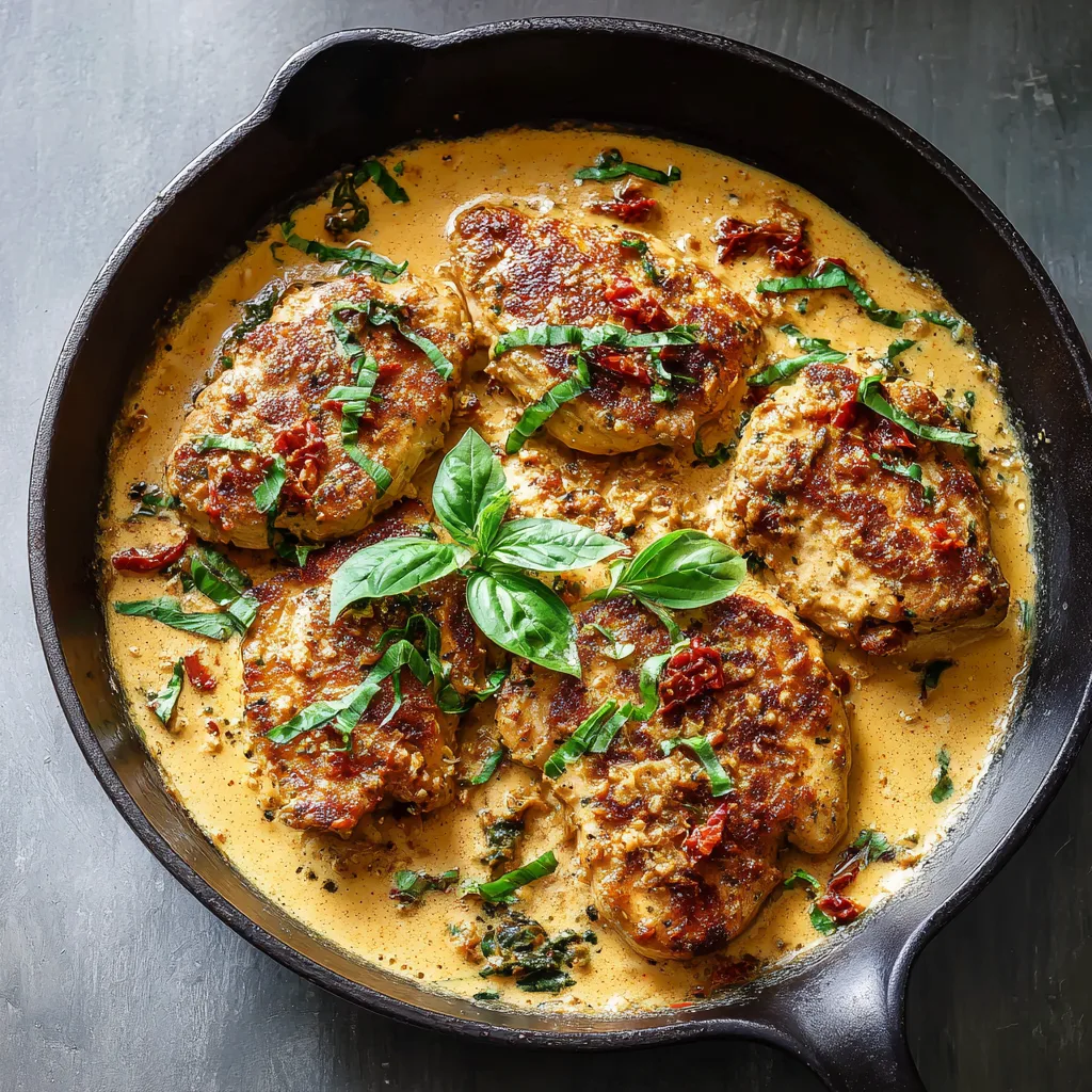 Season chicken breasts with salt and pepper. Heat olive oil in a skillet and sear chicken 4–5 minutes per side until golden. Remove and set aside. - Make the Sauce Base