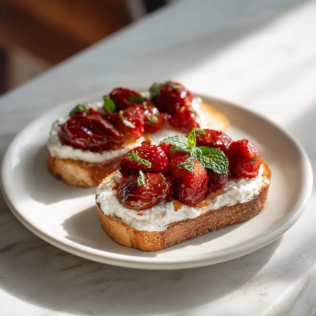 The contrast of crunchy bread, creamy ricotta, and juicy strawberries is not only delicious but visually stunning—making it a true showstopper.