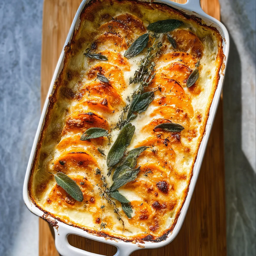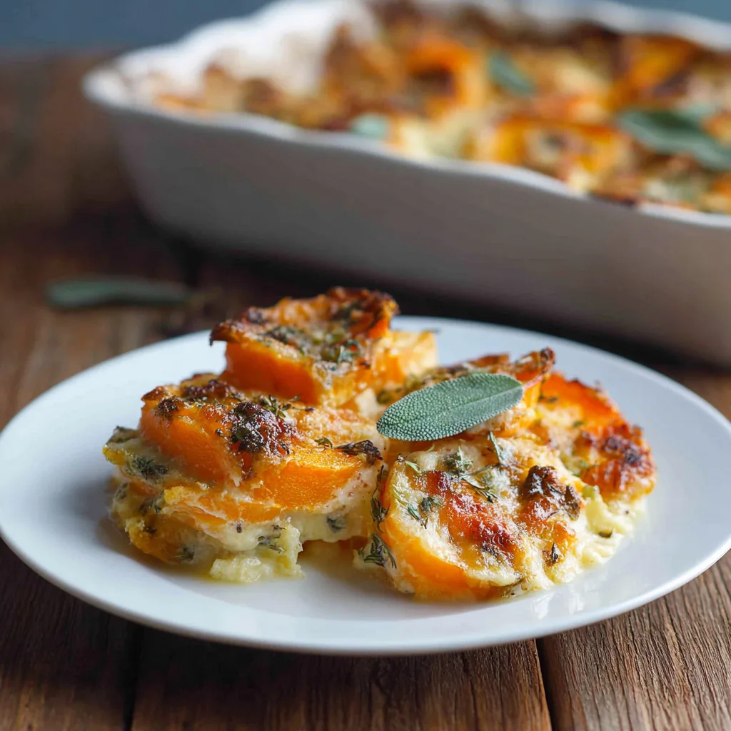 This gratin brings together the natural sweetness of roasted butternut squash with the earthiness of fresh sage. Layered with a velvety cream sauce and topped with golden, bubbling cheese, every spoonful is a blend of soft, tender squash infused with warm, herbaceous flavor.